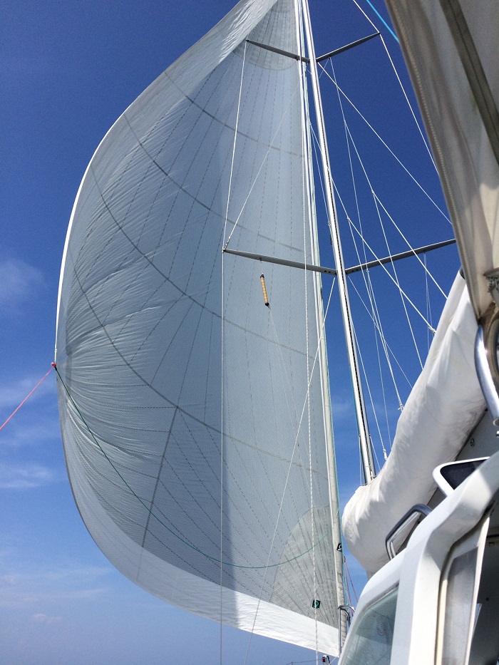 Today, in the calm waters of the Neuse River near Oriental, we tried out the code “0”, a huge sail that’s more like a spinnaker than a genoa. It’s on it’s own roller furling system so it’s “easy” to deploy and retrieve. We were sailing down wind on a broad reach with wind that built to 15kts apparent. This doesn’t sound like all that much wind but keep in mind that the boat was going over 9kts, down wind.