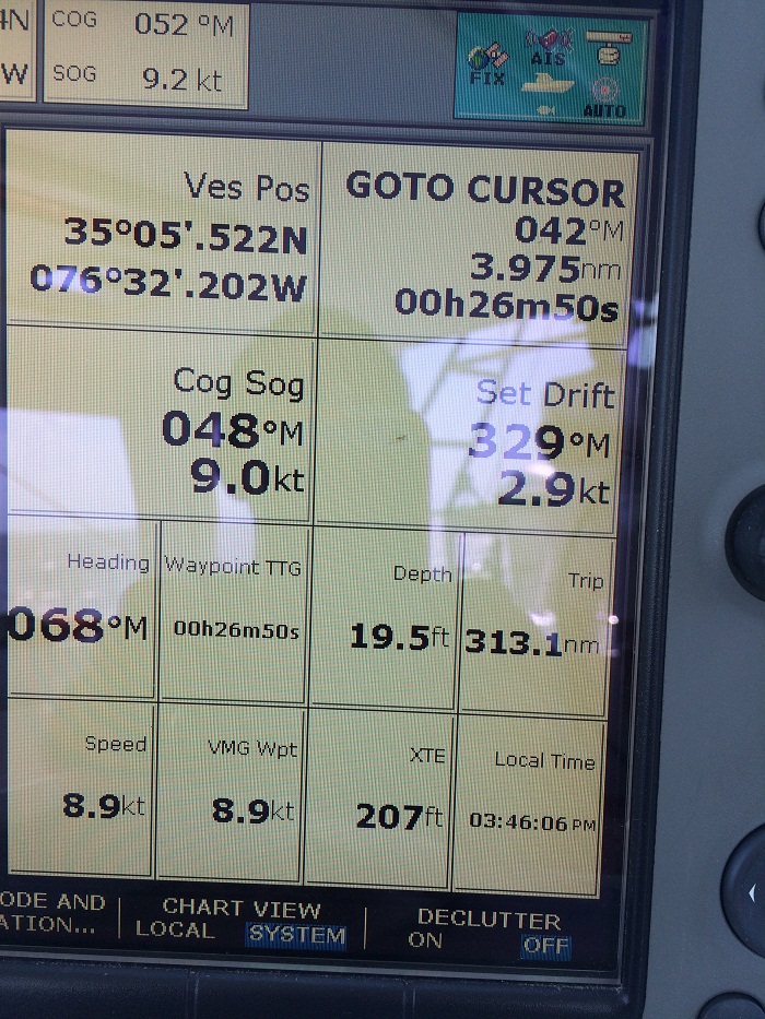 In consultation with Chris Parker, the weather router, we opted to head further offshore and catch the Gulf Stream even though it added perhaps 20 to 30 miles to our trip as we felt that getting the 2-4 knot lift from the current in the stream would ultimately make for a faster run. However, in exchange for that, we “enjoyed” a pretty bumpy trip along the way. On the bright side, my meal prep was not as complex as my two crew members lost their appetite. Worked for me.