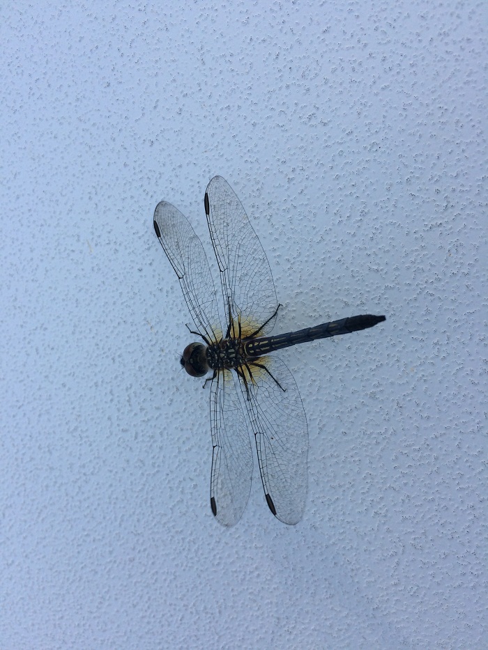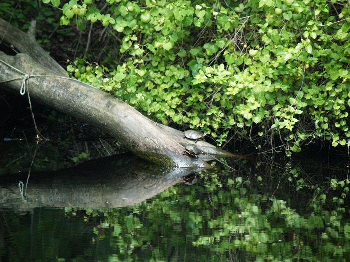 Here is what greeted us as we headed out early this morning from Elizabeth City.  What a great way to start the day.The river winds through bald Cypress stands for miles. We were visited by this beautiful dragon fly.Along the way we made time to stop, although briefly, at the welcome center.  What nice ladies behind the desk.  Southern hospitality and with a smile.  Pandora looked smart at the welcome center dock. There was quite a bit of wildlife along the way.  Turtles on every warm surface.  Notice the rope on this log, it was pulled out of the canal.  That’s the sort of thing that I bumped along the way.  Better out of the water.How about a water snake?   Want to go swimming?  Hmm… I’ll think about that for a bit.This is my first “springtime” visit to the Dismal and there were flowers everywhere and the sweet smell of honeysuckle wafted by on the breeze.