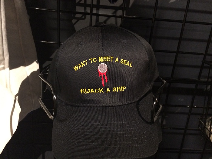 They also have some great displays of equipment that the SEALS use.   They do have some great boats.  I wouldn’t want to find myself on the wrong side of this baby. And, this go-fast boat would fit right in in sunny Florida.  I am not thinking that they would hail me on the radio and say “Pandora, we’ll give you a slow pass port to port”.  Not likely. One of the exhibits is from the Maersk Alabama and they have the lifeboat, bullet holes and all on display. And, no, I couldn’t find a way to get a better photo of the lifeboat.  In case you haven’t seen the movie Captain Phillips, it’s terrific.  Check out the trailer.One of the displays was this nifty gadget for climbing up the side of a ship.   Much sexier than a hook on a line.   Just stick this magnetic crawler on the side of a ship and it climbs up and drops a ladder.  I can only imagine what sorts of gadgets they have that nobody knows about. “Yes, we have some very cool stuff and I’d tell about some of them but then I’d have to kill you sir”.  Ok, got it.  In the museum store, and you HAVE to visit the store in any museum, I was struck by the message on this hat.  Yep, note to self,  best to skip the hijackings.  The store has EVERYTHING.  They even had NAVY SEAL action figures.  The museum also has a great collection of armament from Desert Storm.  I had always thought of SEALS as a group that worked on the water but most of their missions actually take place on land.  I’d love to go for a ride on one of these across sand dunes.  However, not in the unfriendly areas that these guys go in. I can only imagine what it’s like to be deep in bad guy territory running around in the dark.  Better them than me.   I guess that’s the point exactly.  They do it so we don’t have to.