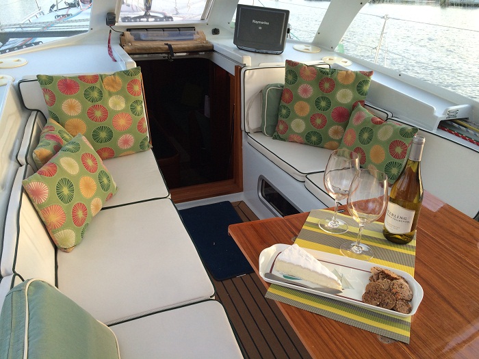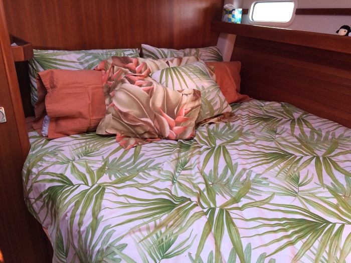 I have been unpacking and organizing Pandora from her run north and trying to sort through all of the gear that we had quickly stowed aboard as well as the stuff that the last owner had left. As their new boat is a trawler, a big switch from a sailboat, they decided to go with an all new color scheme. As a result, they left some of the custom touches such as throw pillows and linens which was great for us.