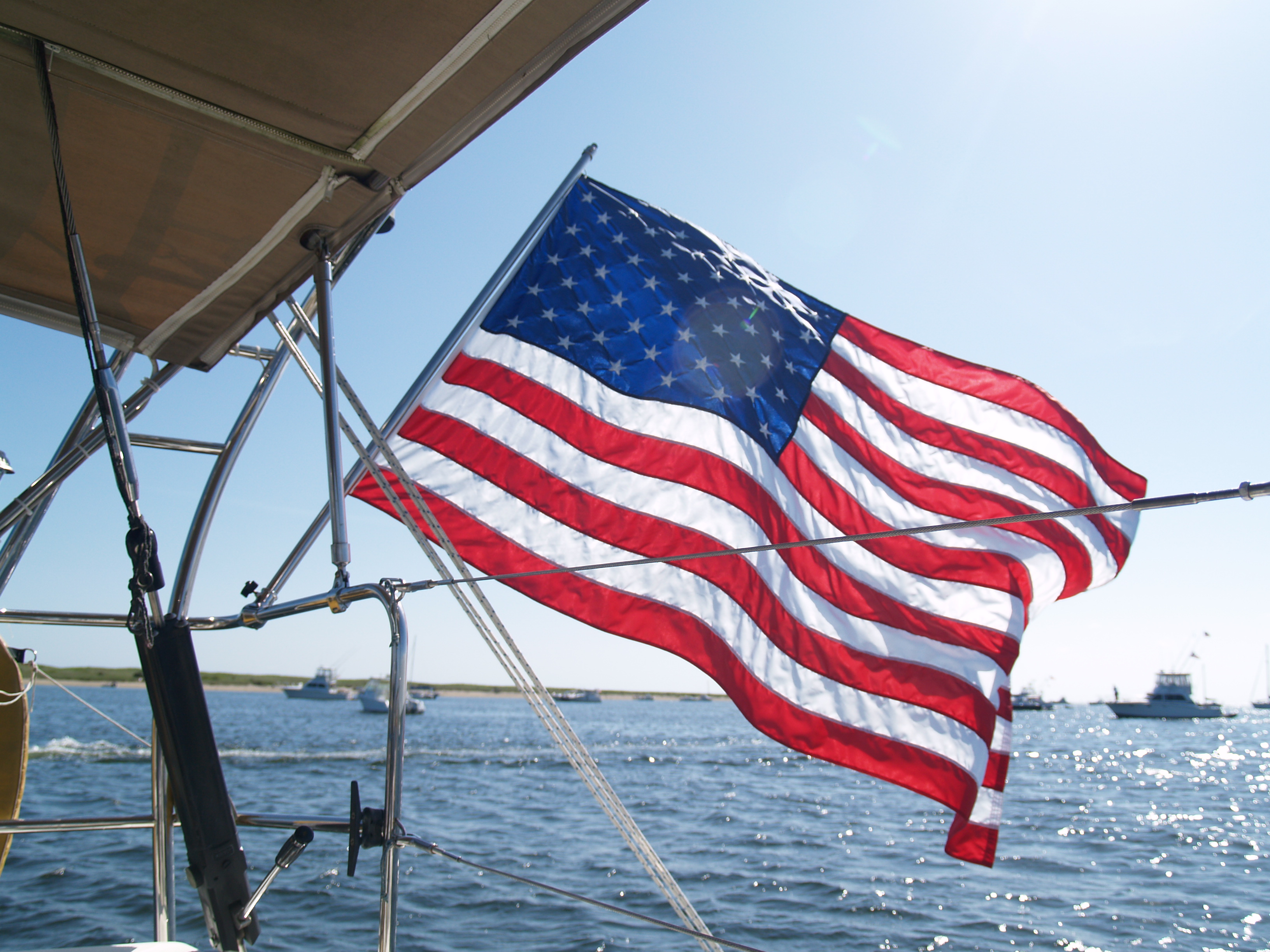 Speaking of proper togs, to stretch the point a bit further, one of my boys gave me this great ensign for Christmas last year. It’s nearly 6′ long. Don’t look too hard at my stainless flag staff. Besides, it’s the flag that’s worth noting. Don’t you just hate the wimpy flags that you see on some boats?