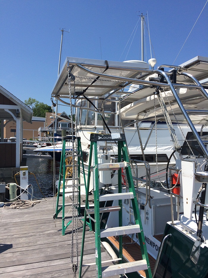 Actually, it took two days to put the panel in place and another day or so to run the interior wires. I backed the boat into the slip. So glad I have a bow thruster. Did I mention that I LOVE my bow thruster? Though so. Then I set up two step ladders and a friend helped me hoist the new panel into place. That went fairly well. No loss of life or panel.