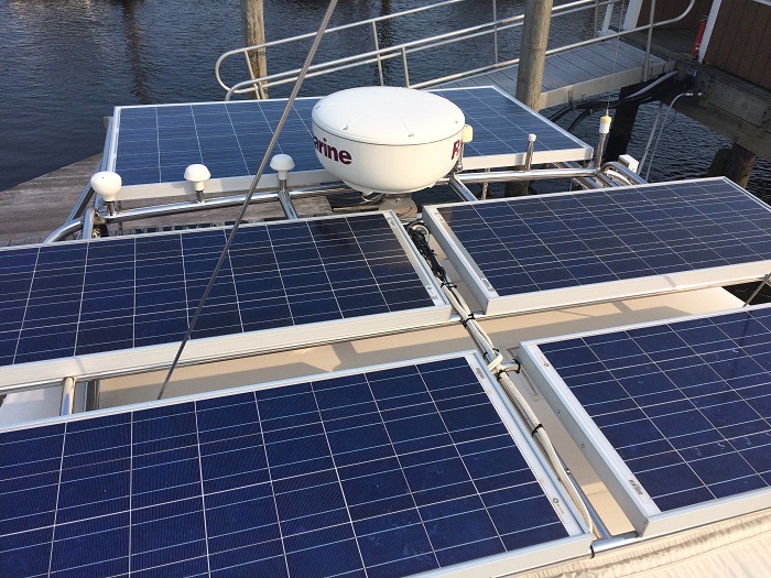 When I was planning the installation months ago and trying to decide how to approach adding more watts to the system, I was concerned about how a really big panel might look. I didn’t want to make the boat look weird with a huge huge extension off of the back. However, in spite of the fact that I did install a HUGE panel on the back, hanging out over the water, it doesn’t really look all that big. I guess that’s because Pandora is even more “HUGER”. Here’s a profile of the new panel all done. Now, wasn’t that easy?