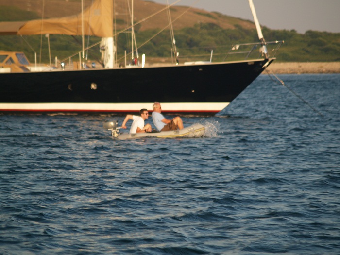 We anchored in the bight outside of the harbor in Cuttyhunk and spent time with friends with them on their boat nearby. It was a lot of fun. I was particularly amused by this sight of “two men in a tub”, a very small and LOW TO THE WATER dink that went by. They were getting soaked and the guy in the bow was pulling furiously on the painter with the hope of keeping some of the water out. Brenda wouldn’t have liked that at all. It reminded us both of our “green bean”, only ours was even worse.