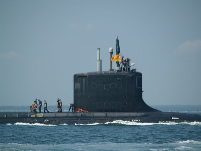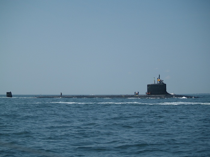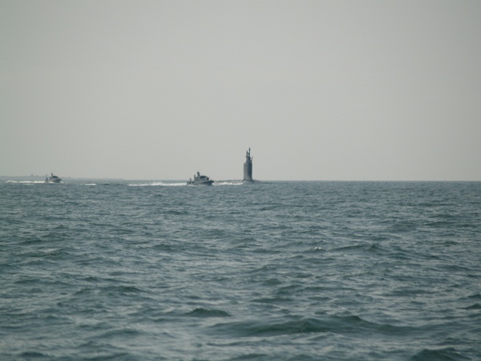 On Friday, as I headed from Wickford RI toward the CT River, where Pandora will be hauled for the next few weeks prior to beginning my run south to the Caribbean for the winter, I was passing New London and heard something on the radio about a sub passing a tug in The Race.  Before I knew it, I saw this approaching me from port.   Or, was I approaching him?  Hmm…  In case you are wondering, he did show up on AIS, cruising at 9kts.   However, no info about size etc.   I guess the Navy doesn’t want their “silent service” guys to show up on everyone’s chart plotter.   It just wouldn’t do for a multi billion dollar sub to be spotted on a $400 AIS receiver, would it?Anyway, I turned to port and luffed to let him pass.   I surely didn’t want to head in front of him, pint size sailing boat right-of-way or not, and besides, the guys on the support boats looked plenty serious as they approached.  They weren’t smiling or waving HI as they passed, flack jackets, machine guns and all. I couldn’t believe how close they came to me, or was it me to them?   I would guess about 100 yards.  I am used to 1,000′ exclusion zone for military ships.   To get a shot of the whole boat I had to zoom my lens all the way out.  She was REALLY close. Just how close?  This close…I was wondering why a sub would sport a yellow “Q” or quarantine flag and when I posted some photos on Face Book I learned about that and more.  I got an amazing number of responses and someone noted that it was the state flag of New Mexico and that the sub, only the second warship in the history of the US Navy to be named so, was the USS New Mexico.  Someone else sent a link to the New London Day, with an announcement of the boat’s arrival.  Here’s a story and pictures of her arrival to an enthusiastic crowd.  She was just back from a tour of the North Atlantic covering 36,000 miles.  One of her “port” stops, about a year ago, on a previous tour, was at the North Pole.  They surfaced through the ice near where the Nautilus, the first atomic sub did so years ago.