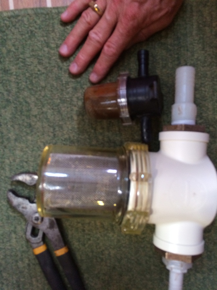 I also finally was able to install a new strainer for the water cooling for the freezer and fridge. The old one, and a pint sized one it was, kept clogging up and starving the water flow to the compressor. Not good and lead to a few overheat moments. Double not good. That would be for b0th the compressor and for me when I discovered the problem. Here’s a photo of just how teeny tiny the old one was. And, let me tell you, a ton of water pumps through this each day, especially when it’s hot.