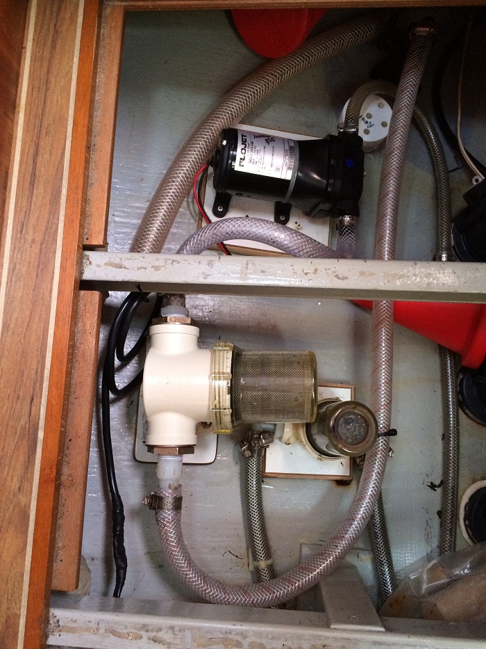 The new setup is much more substantial. I wanted to provide more volume of water and have strainer that was less prone to loading up with weed than the old one as I’ll be leaving Pandora in Tortola for over a month. Yes, someone will be watching her and checking things regularly, but I really, really don’t want to have a freezer of food spoiled or worse, loose my fridge compressor. The strainer to the right, in the photo below, is for the water maker and is about twice the size of the one that I replaced on the fridge. Fingers crossed that this will perform as planned, or should I say “hoped”.