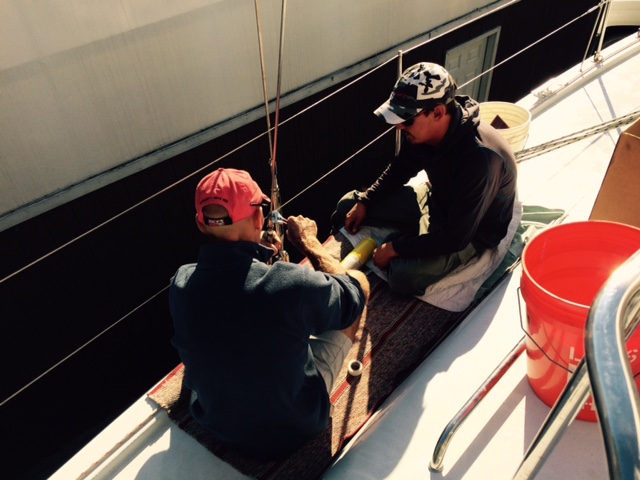 Of course, at the head of the procession was the rigger who made up a new backstay with insulators to allow me to use it as the antenna for my SSB radio. Nice truck guys! I also had them check out the rest of the rig to be sure that there were no weak spots that I should attend to. Don’t they look like they are having fun? So far, they have visited something like four times and no HUGE problems discovered. Whew but “green” indeed!