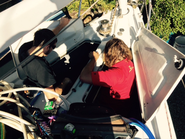 And, let’s not forget the “bow thruster fixit guys”. I can’t believe that I even have one of these nifty gadgets, but Pandora’s is on the fritz. I should also notice that these guys, like riggers, travel in pairs. Thank goodness that Pandora sports not one but two two chain lockers so each guy gets his very own locker. How cozy.