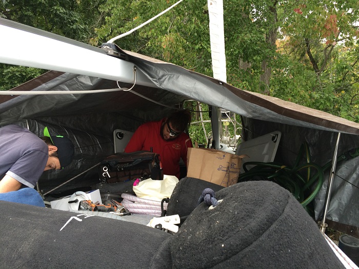 When they came to work on the now infamous hinge pin,  it looked like they were setting up shop for the long haul.  Love the tent.  Like a couple of kids building a fort.  However, these “kids” are getting paid plenty.  10-2-15a 029So, after a few days of my “lubing” very few hours, I am not very confident that the problem will be solved easily.  What am I saying is that “easy” has already left the room.   The next option will be to remove much of the unit and take it back to the shop and press the hinge pin out with a hydraulic press.  Sounds expensive?  You bet…