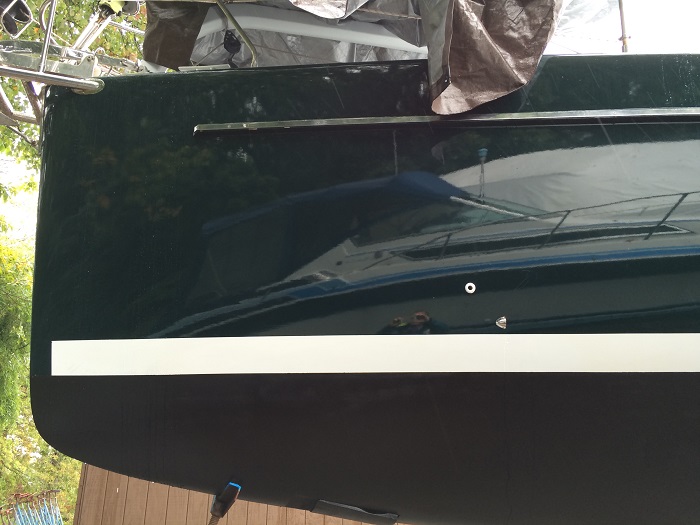 Fixing this is going to be complicated.  The designer and builder worked hard tol design things so that there are no thru-hulls on either side of the hull, only at the stern.  The rest go into vertical standpipes that are glassed into the inside of the boat.   I think that it’s got to be removed and the hole patched but matching the paint?  It’s not going to be easy, even though it’s a stock color.  I guess it’s best to wait till the job is further along and then I’ll readdress the “Ostomy Hole” with him. What was he thinking?