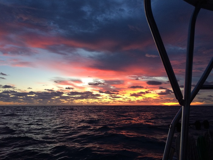With that in mind, we left as the wind was dropping and motored all the way here, around twenty hours. The Gulf Stream was a “non-event” with swells of about 4′ but spaced quite far apart. Crossing the banks, which are shallow, somewhere between 15; and 25′ deep, was a little choppy but Pandora did fine motoring into them. As the sun set to the west we were treated to a spectacular sunset. And, until the moon rose around midnight, the stars were amazing.