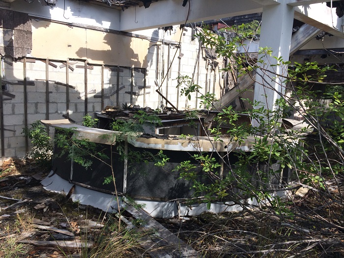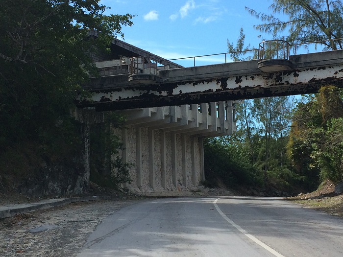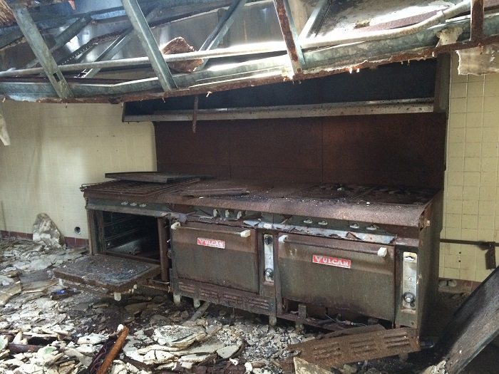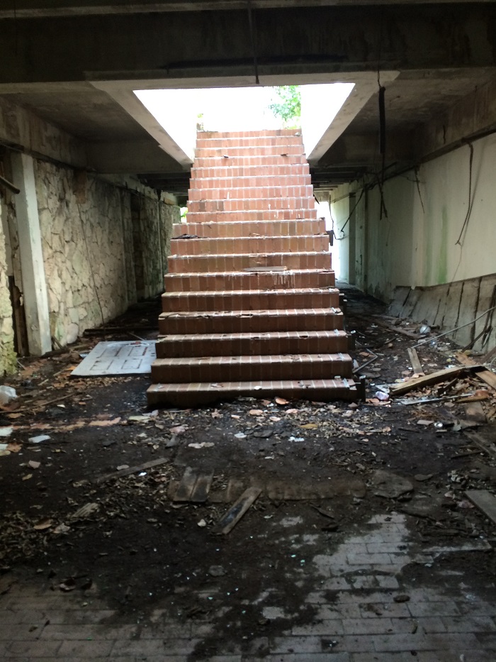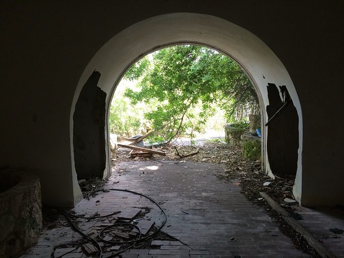 The history of this island is similar to many other islands in the Bahamas with the story of big development that has come and gone. Back in the 60s this island was a hopping place with a resort that was frequented by the likes of Brigitt Bardot and Cary Grant, just to name two that visited regularly.  The resort is now in ruins.  This is how it looked at it’s peak. In the left of the photo above, you can see a walkway over the road. Here’s what it looks like after all these years.  I walked around in the “club house” today and took some photos. I could almost hear the laughter from the lobby bar. I expect that this kitchen prepared some magnificent meals.There was once a wonderful 18 hole golf course.  Today you can still play 9 of the holes although the “rough” is all that, and more. The grand entrance.   No longer looking so grand but it doesn’t take much of an imagaination to “see” what it once was.Nice archway opposite the “grand entrance” staircase.The marina where Pandora will be for about two weeks is just lovely and was built to serve the resort.  Happily it is just terrific. Hans, the manager who’s been here for many years has done a spectacular job of improving the place.  It’s wonderful and a good value.  If you are looking for a nice spot to visit in the Bahamas and want to take a break from  being “on the hook”, this is the spot.