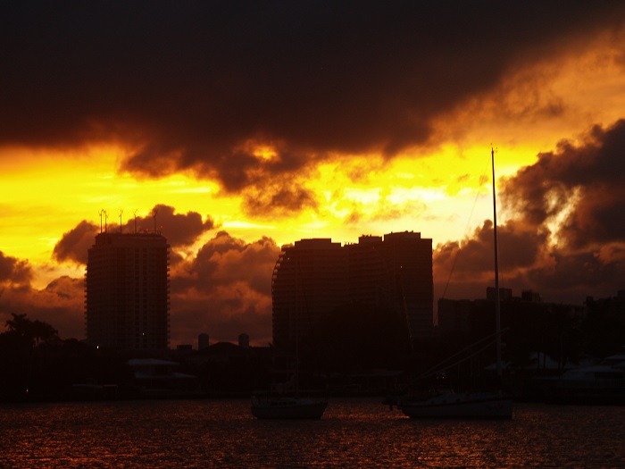 When a front comes through, along with nasty winds, they usually bring amazing sunrises. You know, the whole “red sky in morning, sailor take warning” thing. And this, front inspired, sunrise that arrived in Ft Lauderdale just before Bill and I crossed was quite a sight. .