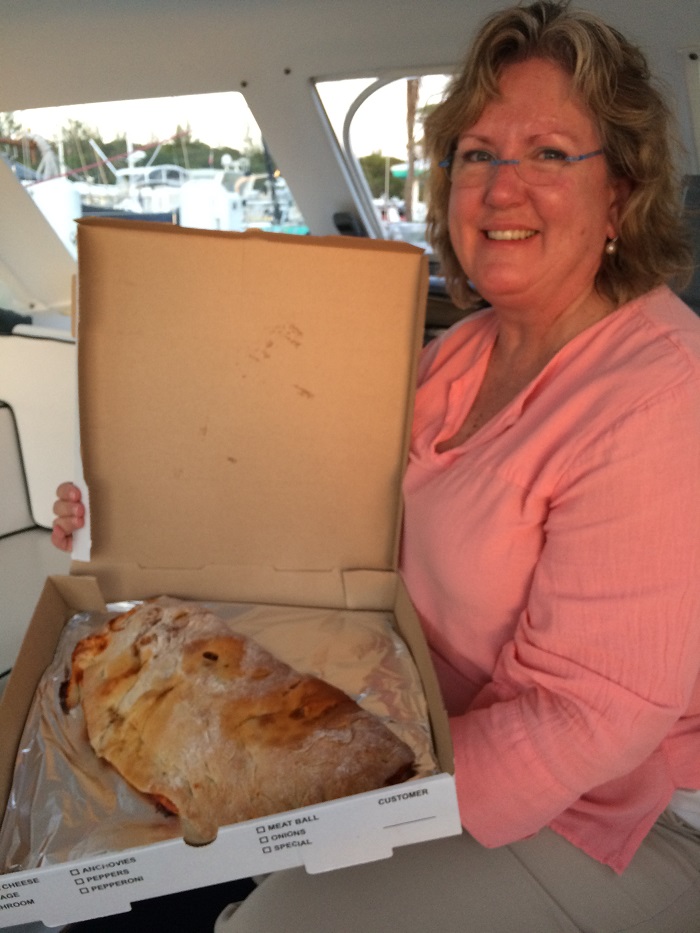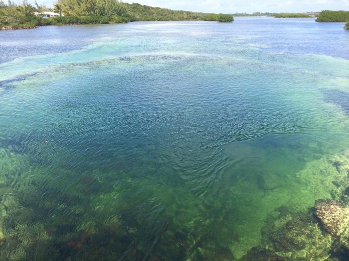 Interestingly, as a past British Colony, some of the most reasonably priced items are biscuits from the U.K. and most places carry a pretty good selection.  Don’t plan on buying cereal as it’s about $10 per box.  PopTarts?  Try $8 a box.  There is a 40% duty on imported goods and a new 15% VAT on top of the cost of shipping the items in.  There’s no income tax though.  I wonder how many accountants there are in the Bahamas.  Not many, I expect. Wednesday night is pizza night at the marina and this is what a $30 calzone looks like.   However, $30 or not, it fed us for three meals.  After finishing off the calzone on the third day, Brenda and I needed a walk., several actually.  Along the way we crossed a bridge.  The water is beautiful where it runs under the road.  This is the view toward the mangroves.  Because of the rushing water it’s scoured out quite deep near the bridge.You can’t tell from here but on the other side of the bridge the current really rips.Today we plan to head to the beach and lunch at the beachside cafe.  Like most every other place here, the menu is pretty limited.  However, they do make a mean hamburger. And, the view of the ocean there is terrific.