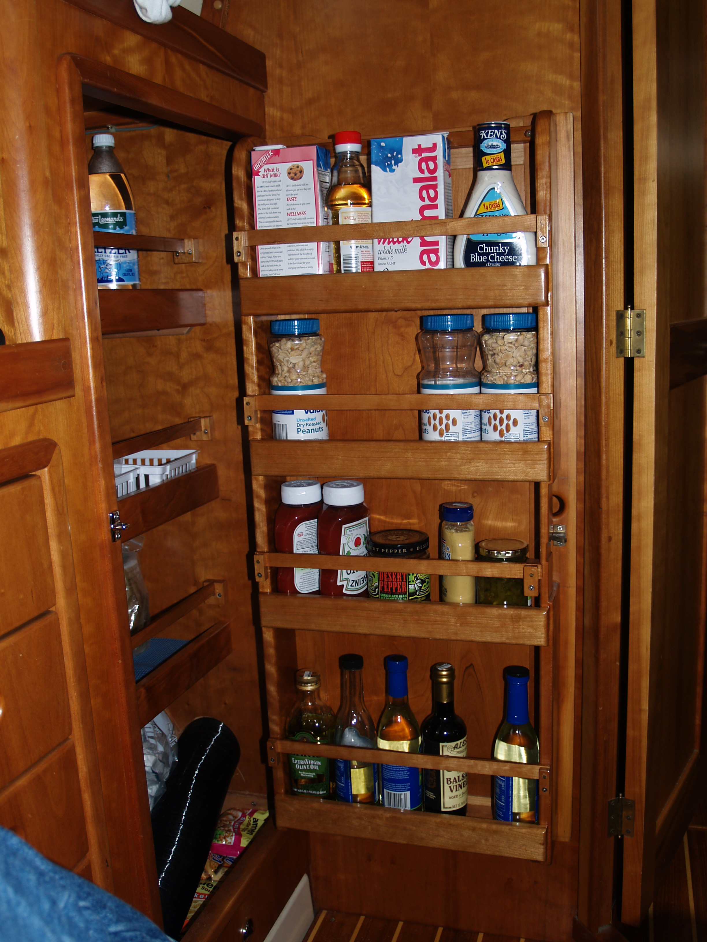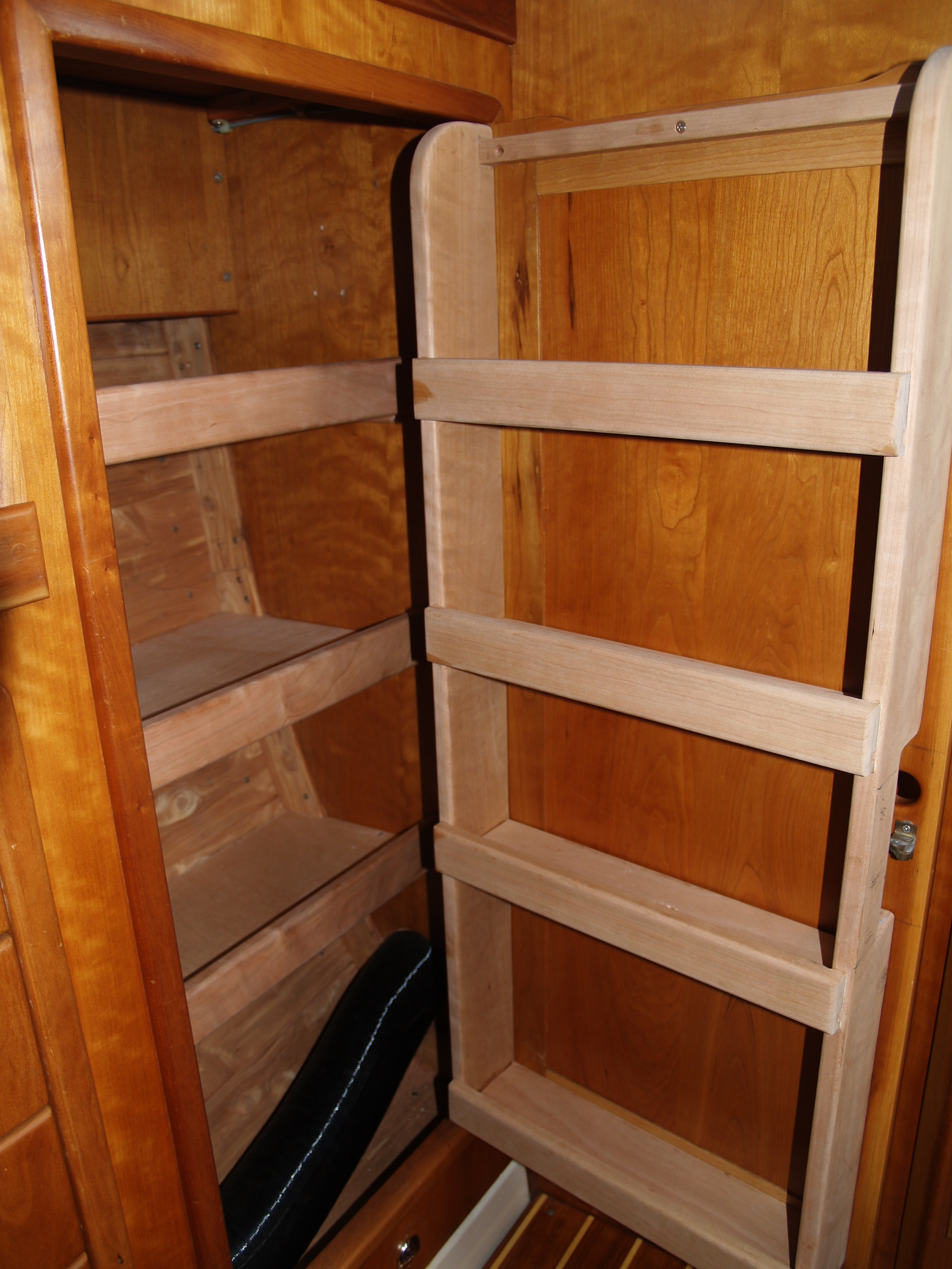 Don’t worry, there’s a strong latch on the outside of the door to keep it from slamming open at an inopportune time. This cabinet will end up holding over 100lbs of stores I would expect. Perhaps more. However, purchasing things now will save money as we head south and only have small markets to visit along the way. Besides, in the Bahamas, things like paper goods, for example, cost twice as much as they do in the States.