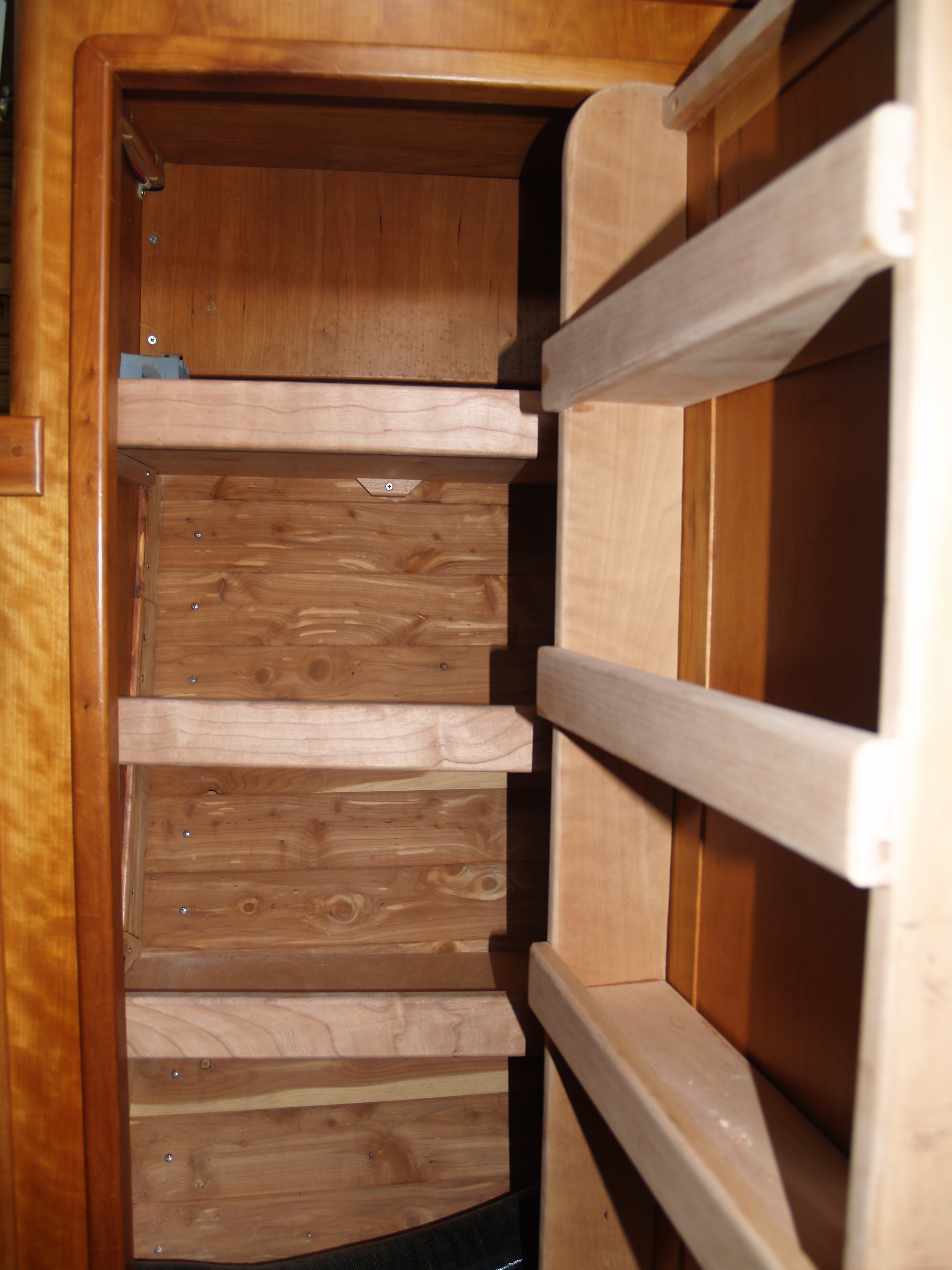 After all was fitted and set, I took the whole mess apart so I could take it home and apply multiple coats of varnish to each piece. After reassembly, I am pleased with the way the project turned out. This is sort of like a time lapse series. Now the completed shelves. In case you are wondering, the black tube on the bottom is for the diesel heater that I put in a few years ago. Now, that was a pain in the backside to install.