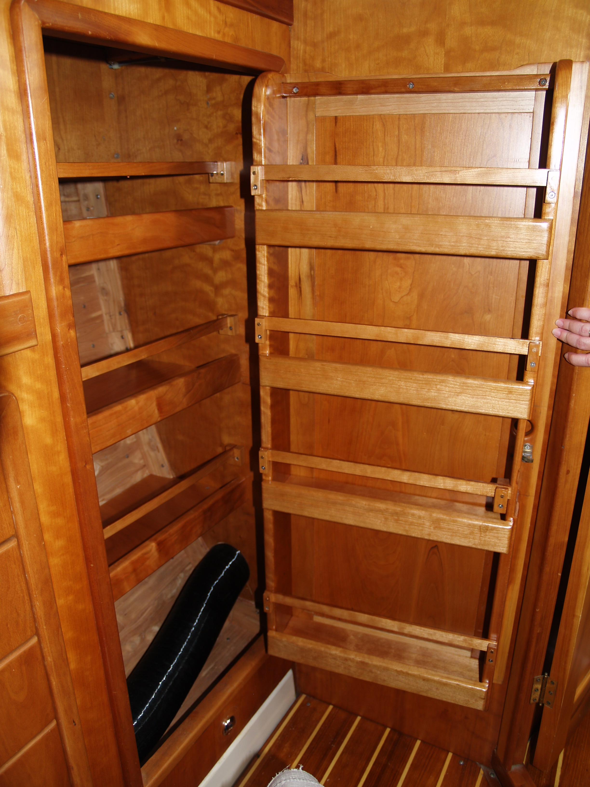 Storage is always an issue on a boat and especially one that is to be used as a home afloat for months at a time. Pandora, while not a small boat at 43′ is petite by today’s beamy boat standards. Fairly narrow at 12′, she lacks much of the interior volume that you would expect from a boat of her size. I was aboard another SAGA 43 some time back and saw that the owner had converted his aft hanging locker into a pantry to gain more space. What a great idea, I thought and decided to do the same thing on Pandora. It seems to me that this is a better approach than using the entire locker just to keep two sets of foul weather gear. Here’s what I started with, minus the hanger bar. Not much there.