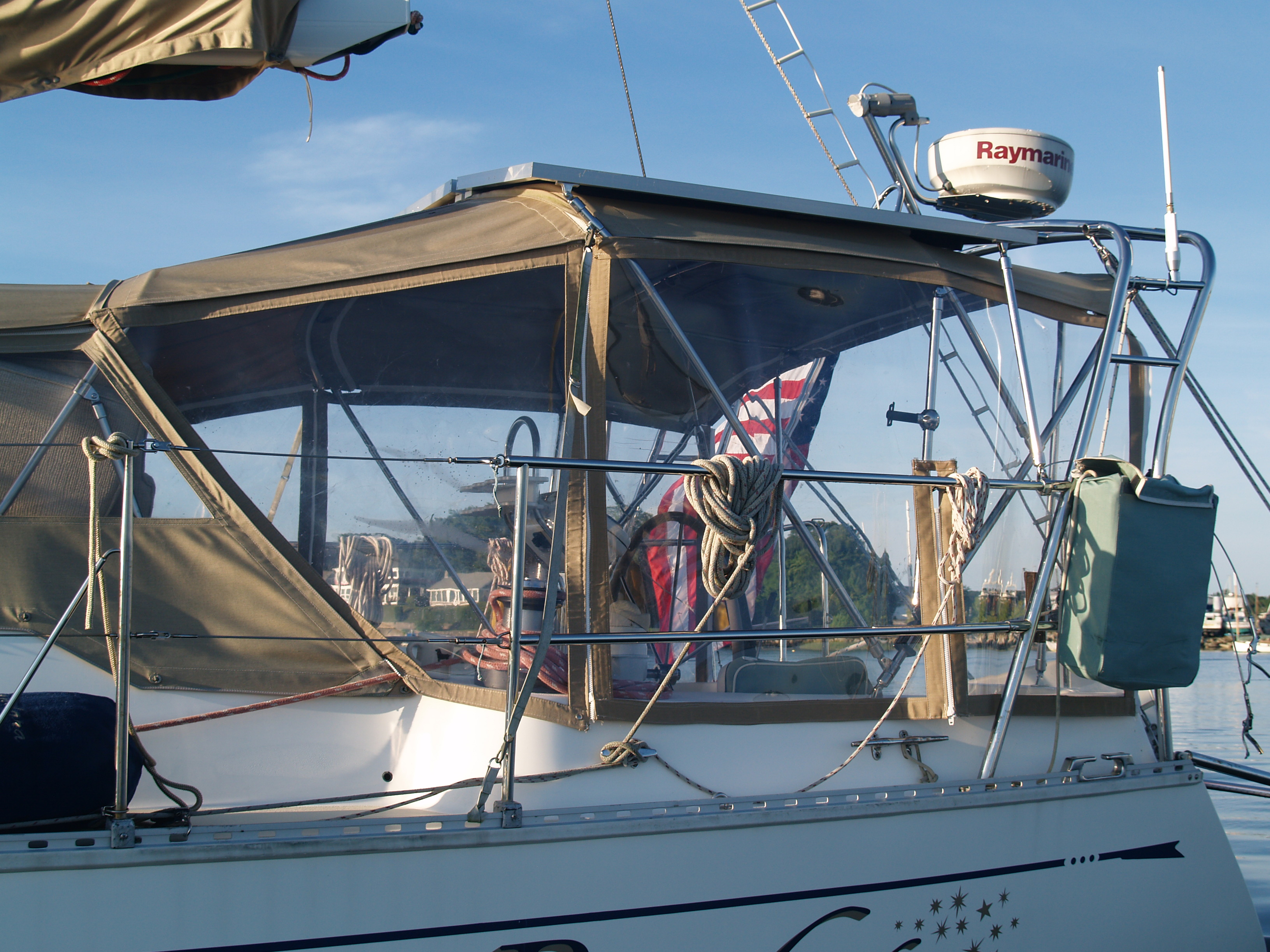 OK, OK, no more whining!!! I have been a busy guy for the last few weeks making great progress on the remaining projects to Pandora. No, they aren’t done but the list is getting shorter for sure. I am almost finished with the cockpit enclosure which will certainly make Pandora more habitable in inclement weather. My friend Rodney teases me that Pandora’s cockpit is so well covered that I can’t tell if it’s sunny or stormy from there. Perhaps, but it’s nice to stay dry when we can. The sides are done but I still have to construct the aft netting. Stay away mosquito, stay away!!! Actually, they may look like simple panels but getting them templated and to fit correctly wasn’t an easy task. We were aboard Pandora for a few days and had one day of teeming rain. These panels proved their value. However, when the sun finally came out… Did someone say greenhouse effect?