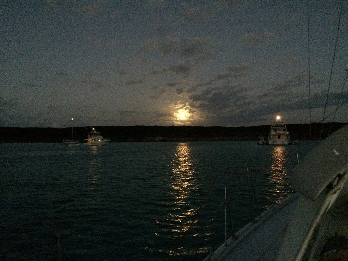And even though it took almost three hours to go the 5 miles from OYC to where we are now, with 2+ hours stuck on a sand bank, we were rewarded with a nearly full moon rising spectacularly as we enjoyed dinner in the cockpit.