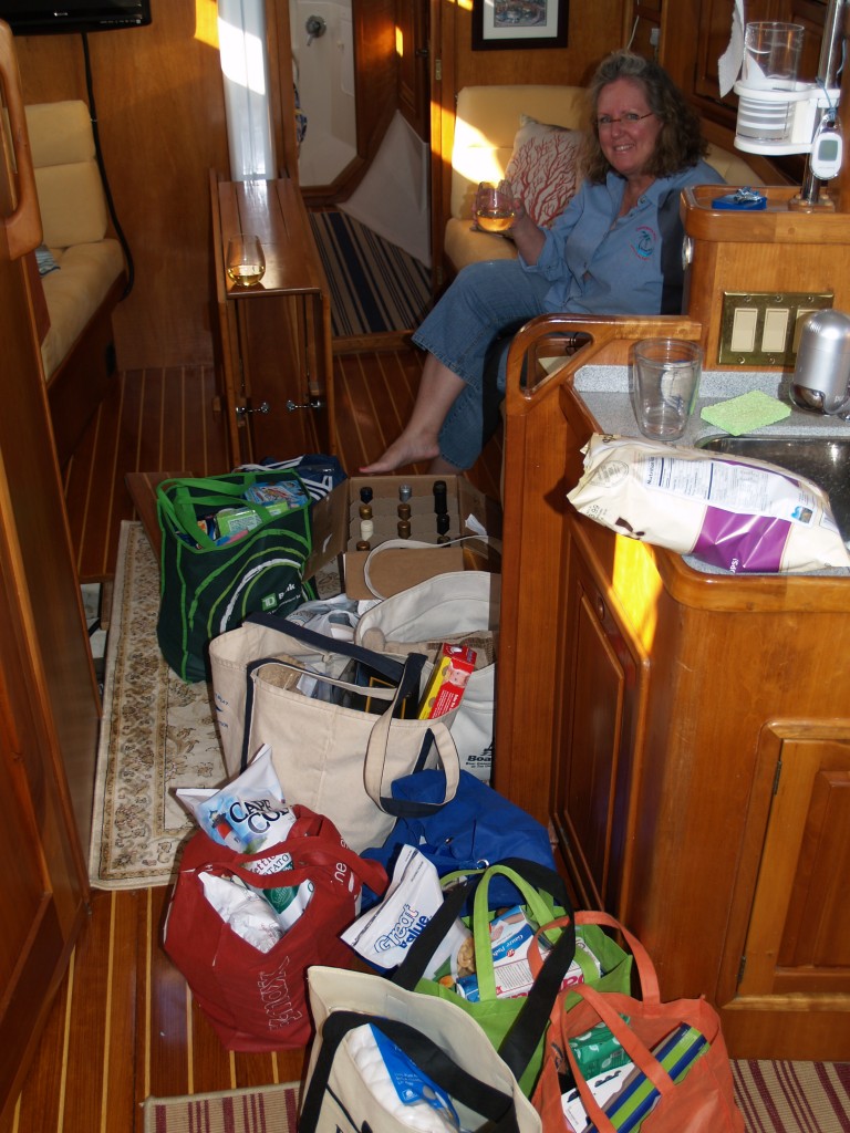 Does Brenda look happy, glass of wine in hand, surrounded by all the rubble? While I stowed each item she logged it into the computer on location and quantity. This little pile is just one of many that have graced the cabin sole of Pandora over the last few weeks. We have been buying and stowing for weeks, no make that months.