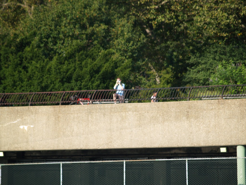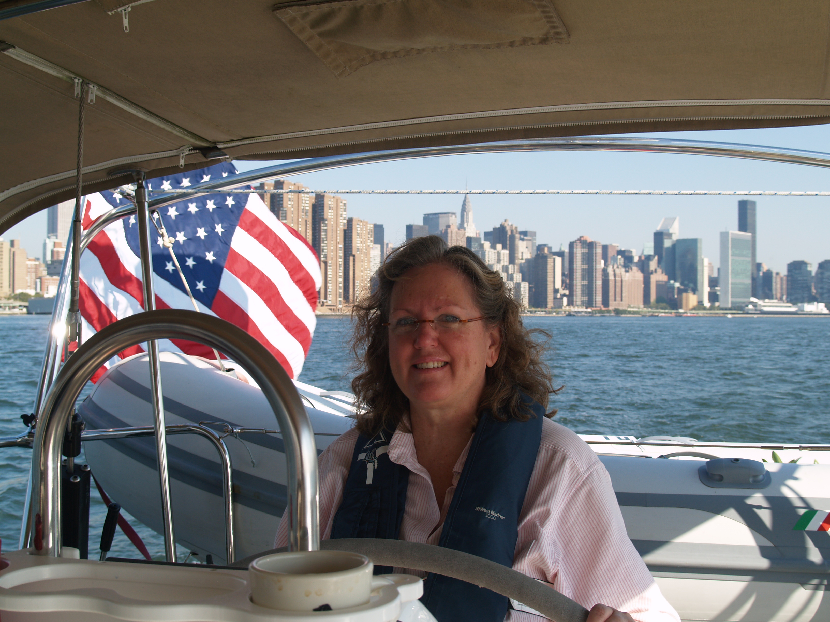Today Brenda and I headed through New York aboard Pandora and had a wonderful trip.  The last time Brenda and I made this trip together was 30 years ago on our 20′ Catboat.  That time it didn’t go well at all.  Had our son Rob been born at that time he would have called such a journey a “career limiting move” for my sailing with Brenda.  Imagine a 20’ boat with a 5hp diesel inboard heading through Hell’s Gate with the tide and spitting out into the Sandy Hook Bay with the full ebb tide and a strong SW wind kicking up a massive chop. Well, at least massive to a 20’ underpowered catboat.   Well, thank goodness it went well today as it took 30 years after the last trip for me to convince Brenda to give it a go again.   Happily, the circumstances were  very different today and even Brenda declared that she had a terrific time.   It wasn’t all about being aboard Pandora that made it a great trip for Brenda.  As this time our son Christopher (He wasn’t even born when she last did this trip) who lives on the upper west side in Manhattan, rode his bike over to the East River to greet us as we exited Hell’s Gate at the upper end of Roosevelt Island.   It was such a thrill to see him standing there on the bike path that Brenda and I both were quite choked up.  However, Brenda was able to hold herself together long enough to take dozens of photos of Chris taking pictures of her taking pictures of Chris…  Well y0u get the general idea.