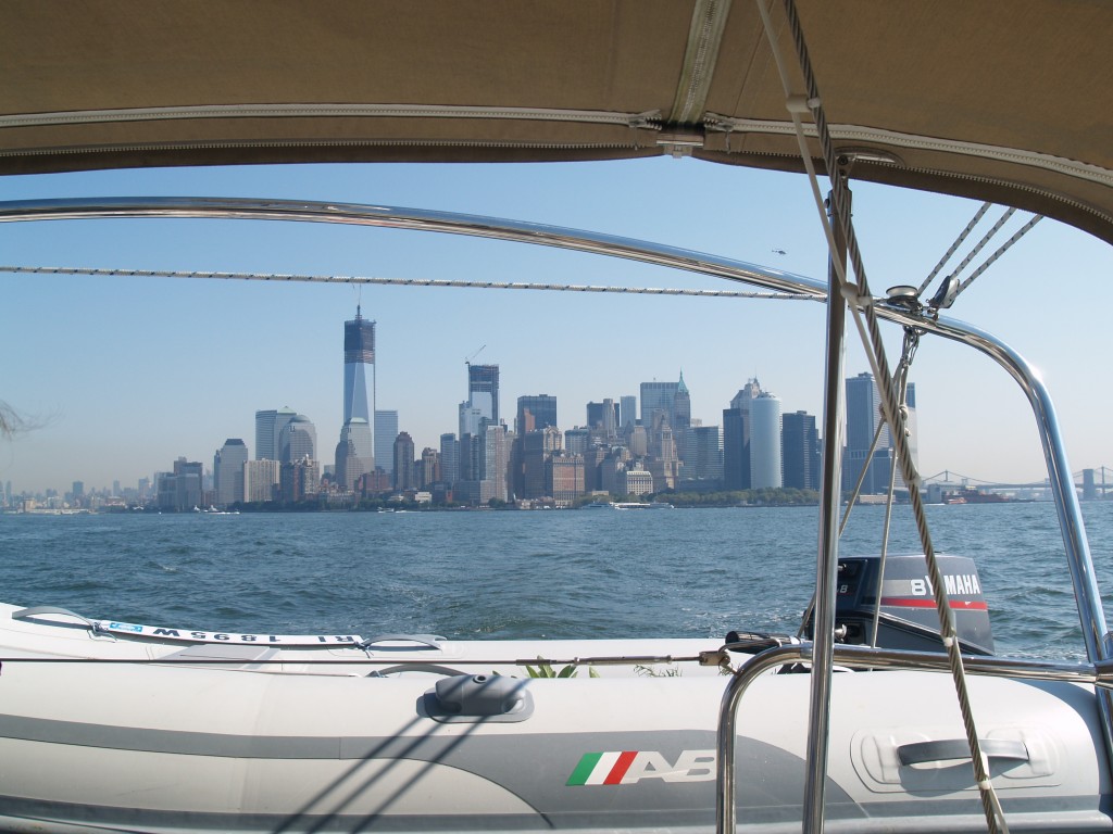 I have gone through NY by boat many times over the years but to do it again, and under such wonderful circumstances, with Brenda was indeed a treat for me.  After “meeting up” with Christopher,uptown,  the plan was to race him down to the bottom tip of Manhattan and Battery Park.  So what happened you ask?   Wh won this big race?  Well,  Pandora wins by a mere ten minutes.  Glad that we had the tide with us.  I can’t believe that Christopher did it at all, and much less that fast.   We only waited at the Battery for about 10 minutes and then, there he was.  I expect that our wild waving and his shouting to us must have been quite a sight for the many tourists that were trying to figure out what the display was all about.