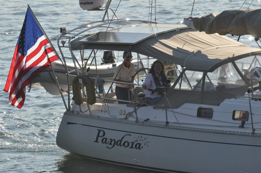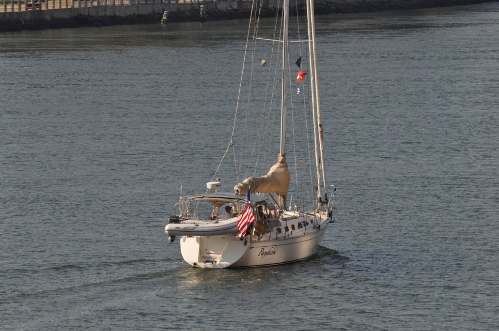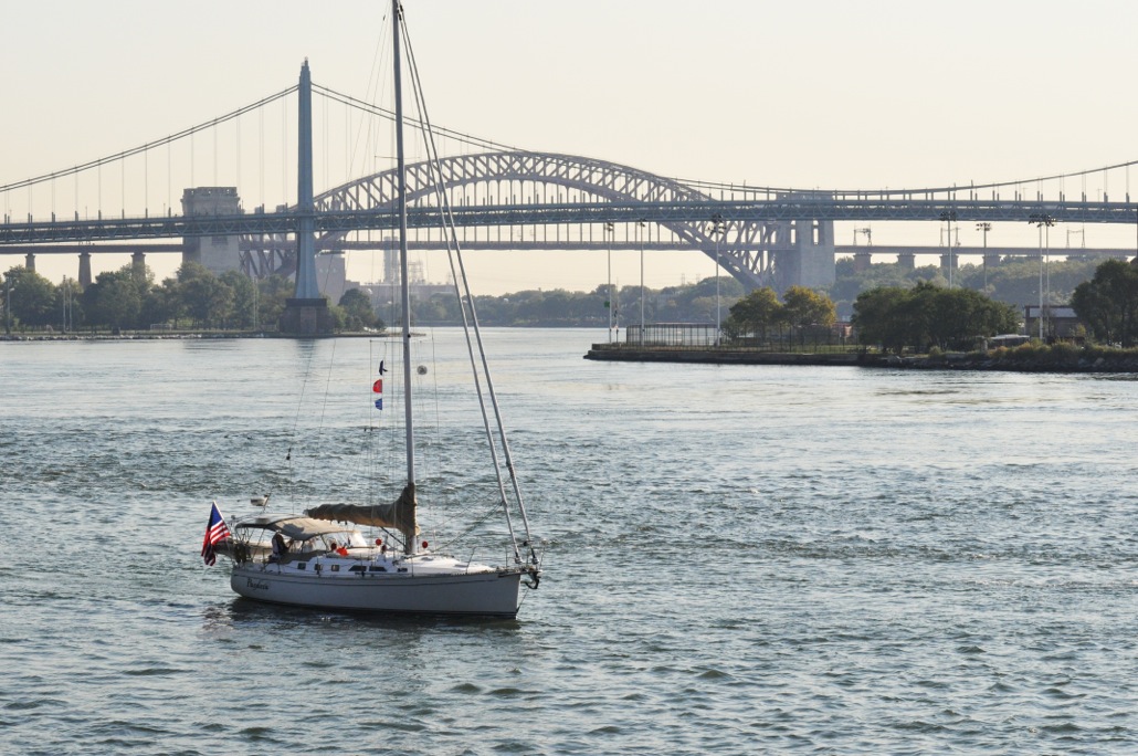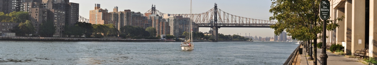 So, are you tired of so many photos of Pandora? Tough. It’s my blog and I can put as many on of her as I want. Here’s one where Pandora is more of a bit player, a panorama as we head down the East River. This one is surely a keeper and I will have to blow it up for display at home when we return. What a view.