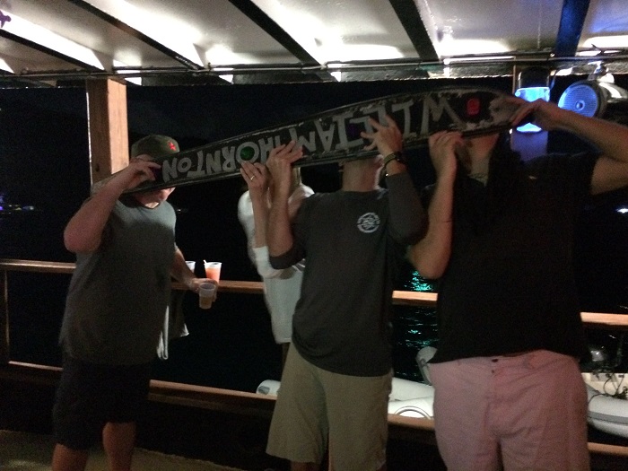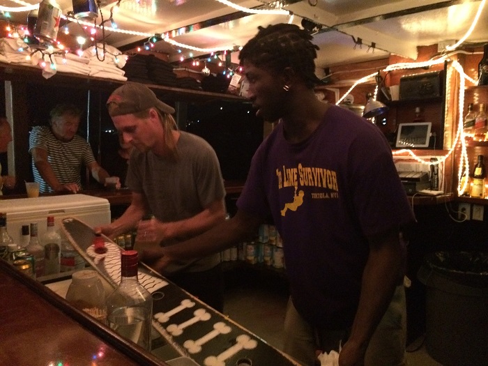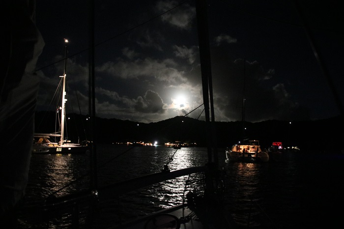 As the sun set and moon rose above the mountains it was amazing.And, after dark the “animals” came out to play.  Willy’s boat bar, and it’s a sort of converted small freighter, is on a mooring in the cove and is THE spot to be seen after dark.  And as well kept as the beach bar is, Willy’s is the exact opposite and the PERFECT place for the charter gang to “let their hair down”, way down, well into the wee hours.
