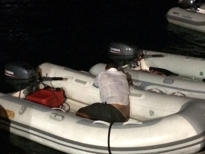The bar tenders were eager to serve and serve they did early and often.  The guy on the left was also busy dealing in what one reveler called “Colorado Salad” on the side and in plain sight.  No need to be secretive in the BVI mon.As the evening ramped up, two boat loads of charterers, festooned in flashing lights arrived ready to rumble.After a few beers there was a handy sign on the head to keep everyone up to speed on the rules. Willy’s also has a particularly charming custom of putting four shot glasses of who knows what into specially drilled holes in an old waterski.  The idea is for four to stand together and as the board tips, everyone drinks at the exact same pace. And the pace is really, really fast.After a few rounds with the waterski, this fellow decided it was time for a nap.  Doesn’t he look cozy in his dink? He even took time to peek over the side from time to time.After a while his girlfriend, well that’s what I think she was, decided to keep him comfortable. How sweet for her to support him like that.  There was pounding music and plenty of dancing.  I was particularly amused by a group from Ukraine headed up by a sort of soft and pudgy “mini oligarc” holding court with his girls.  The girls seemed way more interested in impressing him than he was in them.    I guess he thought that he was “all that and more” on his 50’ Moorings charter cat.   Perhaps the girls didn’t realize that his father moved in circles where the boats were about 10x that length.   Perhaps they were in “training” for bigger things.