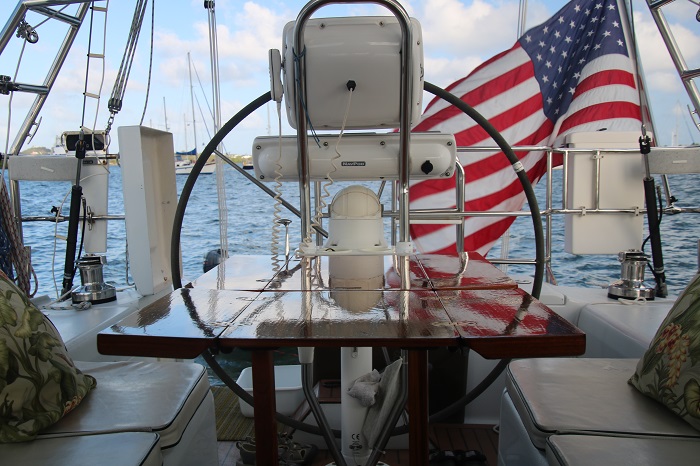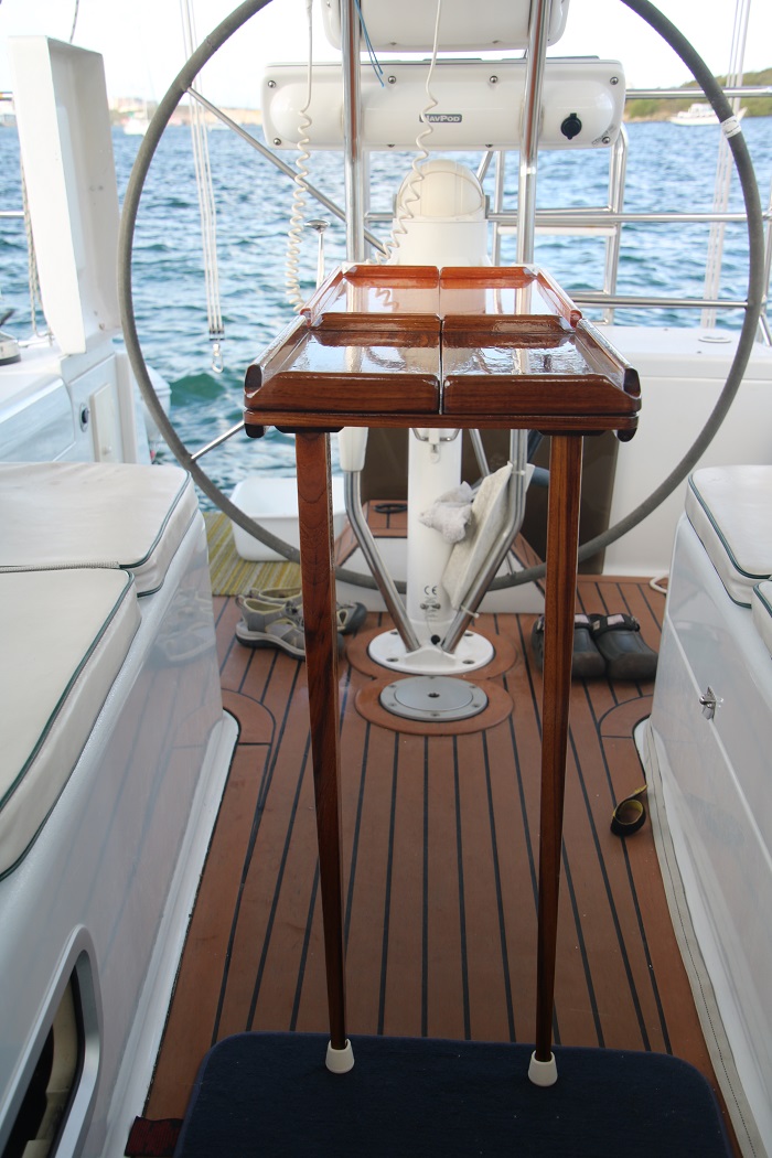 Oh yeah, one more thing.   Remember the extension for the cockpit table?  Well, it turned out well. Here’s a shot of it in the “cocktail” position, folded up. And in time for dinner, folded out and ready for action. It’s even big enough to fit a baguette, cheese and a glass of French wine.   No, make that two glasses.  Good thing as there’s plenty finding it’s way aboard Pandora here in St Martin.