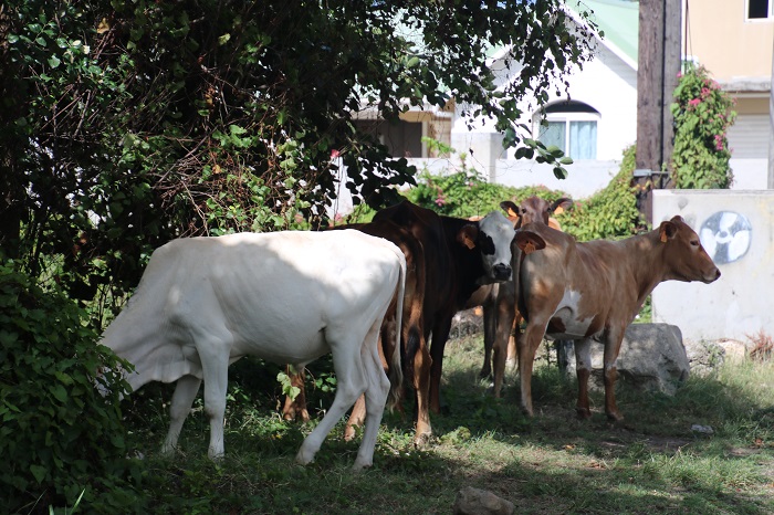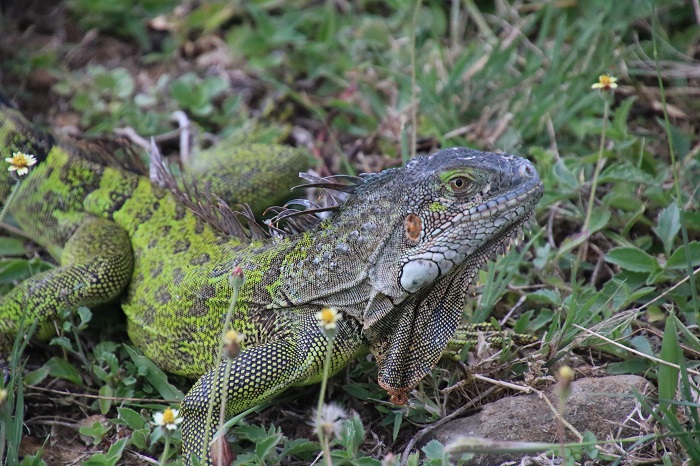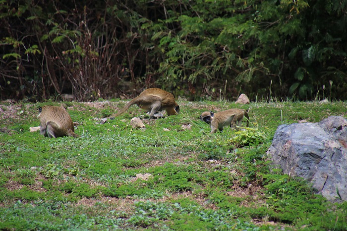 Near one of the beaches, we spied this “herd” of cows.  They look like they would be more at home in India.  They didn’t seem to be particularly concerned about being run over as the ambled across the road in front of our car. When we headed to the top of the highest mountain on the island yesterday, we were happy to learn that there was a road that went nearly to the top so we didn’t have to hike the entire way up.   However, it became very rugged for the last few miles so hoof it we did.  No, this photo wasn’t off the rugged part.  You will just have to trust me on that.  Acutally, it was a lovely walk.  It was a LONG way up.   However, once there, the view was spectacular.   And, speaking of wind, the wind, already blowing in the high 20s, really accelerated as it hit the mountain and whipped up the side.  To stand near the edge was a bit unnerving as it blasted at  me in the gusts.On our way down the mountain we stopped at a wonderful private “park”, Loterie Farm.   It’s a large beautifully laid out property featuring several places to eat as well as rooms for rent, hiking and an impressive zip line course, your choice of exciting and “estreeme”.  For lunch we ate in the “Tree Lounge” a sort of deck/treehouse.It was a very nice spot to enjoy a plate or two of tapas dishes.  And yes, I had a drink that might have come with a little umbrella.  It was pink and I can’t say that I totally recommend it.   It was colorful though.  Very colorful.   However, the environment made it taste pretty good in spite of it looking sort of like a rasberry slurply from 7/11 but with cream. The view from the tapas lounge was lovely.If you wish, you can rent a treetop cabana near the pool. Pretty chic. Nearby we saw a troop of monkeys.Some large iguanas too.  I got pretty close to this guy.  Beautifully patterned skin, scales, whatever.There was also a lovely spring fed pool complete, or not completely complete, as it were, as it was “topless “ optional for the ladies.   Welcome to France.  “Here, give that cute baby a cigarette so she will grow up to be thin like me”.