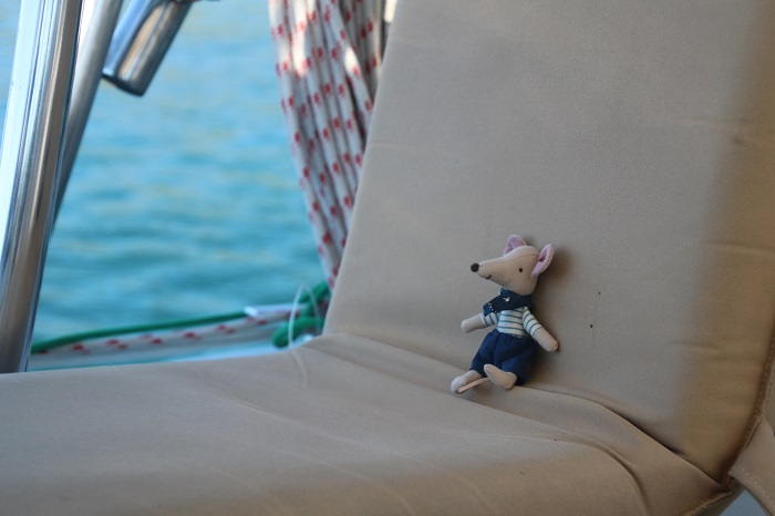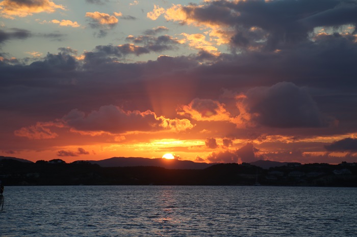 As we left the harbor, we passed this “sailing” cruise ship.  I think it would take a virtual hurricane to get this baby moving under sail alone. This was more my type of “cruise ship”.  I expect that there is a very good ratio of crew to guests on this beauty as it’s a private yacht.  In my next life perhaps…  Perhaps not…Anyway, as we made our way down the coast toward Nunsuch Bay we passed some really dramatic scenery.  Not particularly lush as Antigua is a dry island but beautiful, never the less.   That’s Kalunamoo, Bill and Maureen’s year round home (the boat, not Antigua), BTW.  However, in spite of the “nothing between us and Spain thing”, the water in this harbor is flat calm, compliments of a reef that breaks the waves completely. Nearby there is a tiny, oh so scenic beach.  I took our dink there for a walk.  Not the dink.  I went for the walk.  The dink stayed on the beach, of course.   The area near the beach is rugged and I couldn’t find a trail, but the cove, lovely. Pandora’s new mascot and crew member Louis, (that is to be pronounced with a decidedly French accent, of course as he is from St Martin, on the French side) was happy to lounge for the afternoon on one of the “chaise” lounge chairs aboard Pandora.   He has settled in nicely to life aboard Pandora. One tradition with couples aboard cruising boats, well at least the ones we know, is to get together for “sundowners” and pot luck suppers.   And, last night we hosted a gathering aboard Pandora for the “crews” of six boats.    Louis was quite excited and spent much of the afternoon waiting for his “friends” to show up.  He gazed longingly at Kalunamoo, waiting for Bill and Maureen to visit, particularly Maureen as Louis is French, of course.Finally they arrived.  He was happy that the “guys” stayed up in the cockpit talking shop, while the “ladies”, his favorite of course, were down below with him.  He took this group shot.  Nice collection, he thought and he had them all to himself.  However, he did keep a low profile so as to not dominate the conversation.  Besides, his English is still a bit rusty. Everyone contributed and what a spread it was.  Yum…As if to put a final “capstone” on the evening, the sun put on a wonderful display with a perfect setting.  And you know how much I just love sunsets. It is evenings like this that are among the best of cruising and to be in a “far away” harbor among friends is a great way to spend time together.  Yes, home is indeed where we are and right now that’s aboard Pandora.  Besides, Brenda likes to say that her favorite part of cruising is “being anchored” and we have been anchored in a lovely spot indeed.