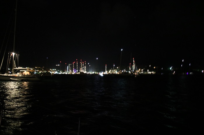 Well, I guess that’s about all I have to report for now. Perhaps I’ll close with a shot of all the “big girls” in the super yacht marina nearby. Lots of brightly lit masts. Note the red lights at the top of the masts. That means that they are over 100′ tall and need a light to warn off low flying aircraft. And, I will tell you that many of those masts are 200′ tall including the masts on Marie, the 180′ yacht Brenda and I sailed on in Newport two years ago. She came in yesterday. Perhaps I’ll stop by to see if I can borrow a cup of Chivas.