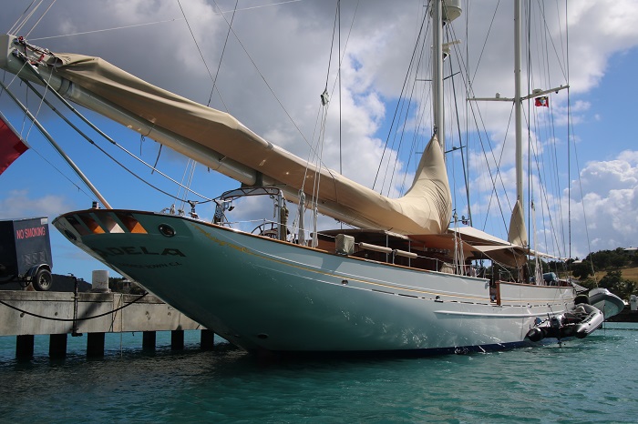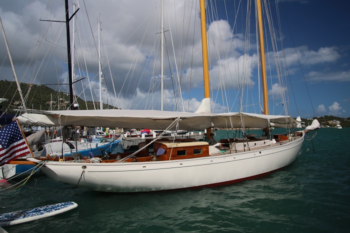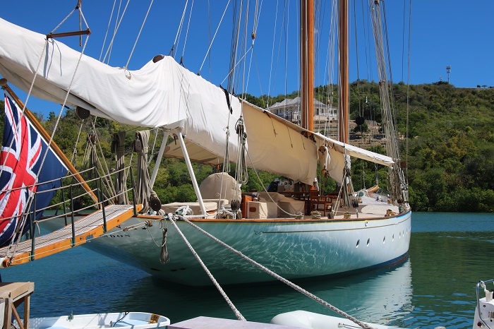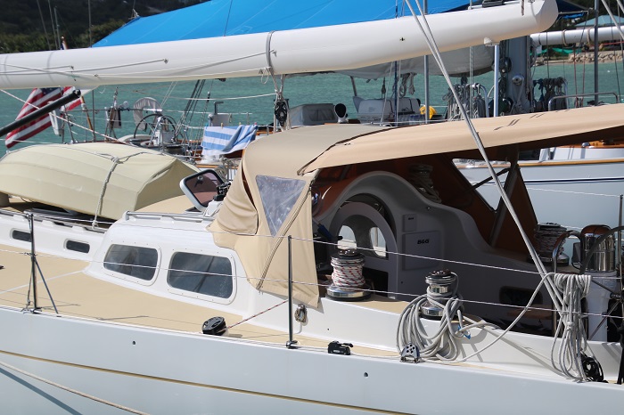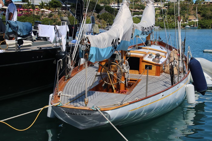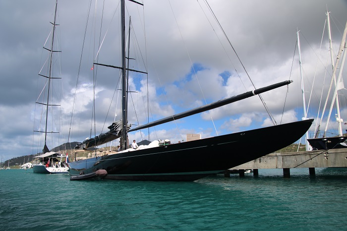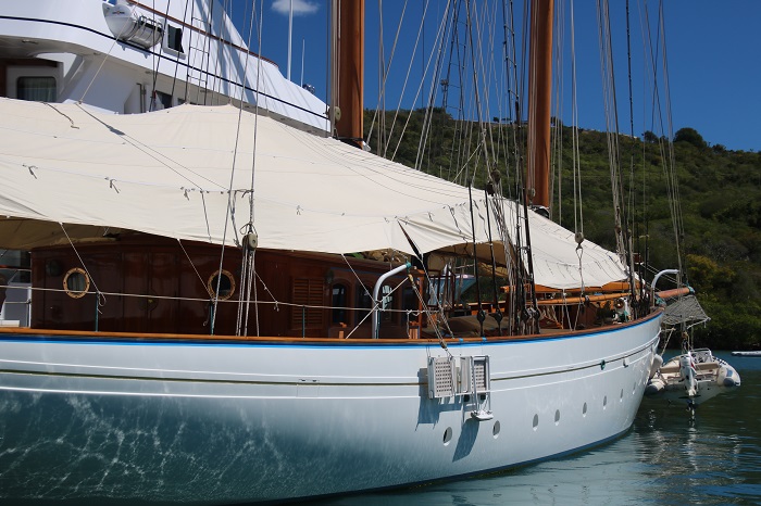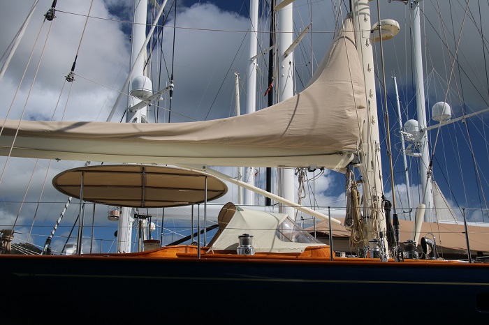Not certain which one this is.  I think Lionheart.  It’s just so hard to keep them straight.   So many Js to choose from and most of them are here in Antigua right now.   Imagine the spinnaker that uses that pole?Amazing overhangs. Not all of the big sailing yachts are Js but they all sport those lovely lines. Nice butt too.Interesting bimini.  Perhaps not all weather but hey, the owner isn’t going to be slogging to weather in a gale.  That’s the job of the crew.