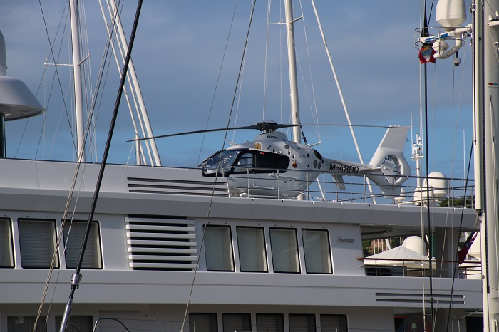 When we sat overlooking Nelson’s Dock Yard at lunch the other day, the view included some magnificant yachts, each swarming with workers painting and varnishing. There’s two huge schooners from the UK that are right next to each other, a sort of “his and hers” deal.  Workers with brushes all over each of them getting them ready for the upcoming classic yacht races. Some of the yachts are hard to actually see as they are covered with so much canvas to protect the decks and all that paint and varnish from the tropical sun. I think I used a shot of this beauty in a previous post.  However, as the “belle of the harbor” I just have to show her again.  I wonder how many crew it takes to keep her looking like this?Not all of the yachts are not classics but many are.   This one, complete with a serious looking flat black hull sported it’s own chopper. I thought that this was an interesting boat.  The companionway is unique.  I expect that the dodger wasn’t part of the original design.   And, not even a tiny bit of varnish to look after. No varnish on this racer either.   I’ll bet she screams on a reach and is really noisy with a tooth jarring ride. This yacht looks like it can go just about anywhere with it’s wave piercing bow.Nice dink.  No getting wet when crossing a choppy harbor in that. Not your usual bow profile.  Surely she can go into most anything without slowing down. And, speaking of bows.   Many of the classics sport enormous overhangs. Especially the classic America’s Cup Js from the 30s.  This is Ranbow.  She’s actually not original but was launched just a few years ago from the original plans.  And, she, like all the Js sailing today, sports carbon spars.  Beautiful. Not a lot of cabin varnish to keep up on a 90′ yacht.   It’s perfect though. There’s something like less than a dozen of these classic J yachts in the world today.  However, there are more now than in the 30s, when they raced for The Cup.  Several have been recently constructed to original plans drawn and never built.  Of course, they raced during the Great Depression.  It’s interesting that several more were also built during the recent Great Recession.   Says something about the rich getting richer.