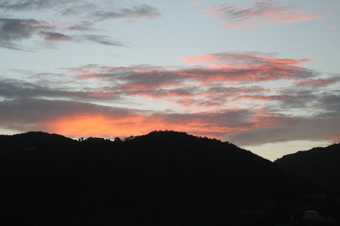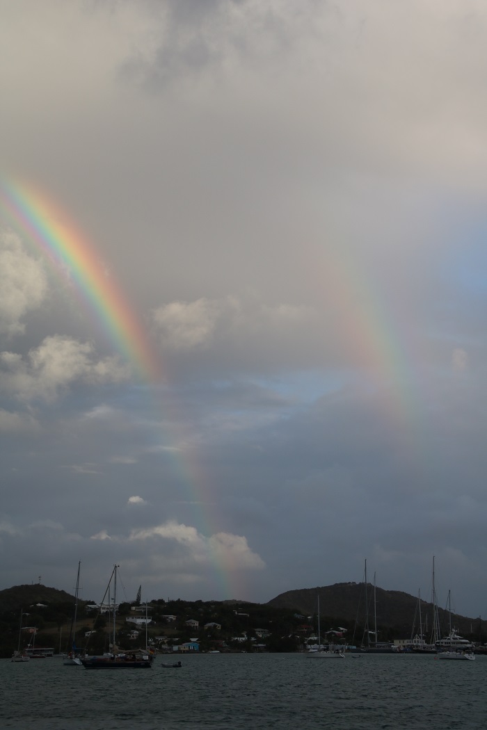 And, to continue on that vein, how about last evening’s sunset.  You know how I like sunsets. Ok, while I am at it, I’ll toss in today’s sunrise.  Yes, I know, it looks a LOT like one I put up a few days ago.    But it’s nice. Ok, one more thing.  How about a double rainbow?   While every day is a sunny day, it often rains several times for a few minutes.  The sun goes away as a dark cloud passes overhead , we run to close all the deck hatches, it rains, it stops raining, a spectacular rainbow appears, we say “Oooo…Ahh..” and we open up the hatches again until the next shower.