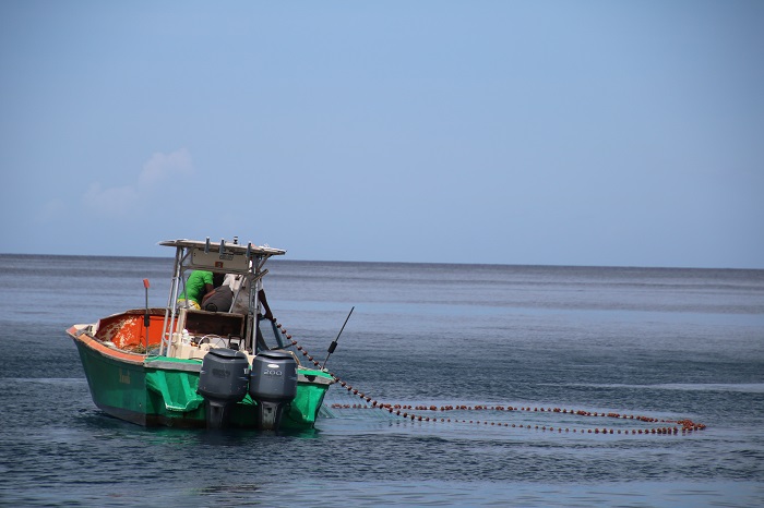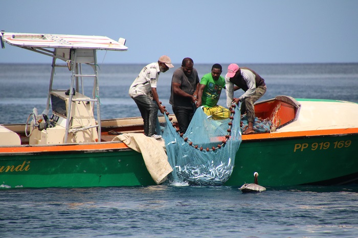 Crazy flowers hanging inside and the very oddest color.  They looked like they were dyed this odd color of blue.  Very fleshy and each cluster was about 18″ long.  Here and there, cozy sitting areas to sit and enjoy the scenery. Of course, what botanical garden is complete without flamingos?  Unfortunately, these were not the bright pink one associates with these as that color comes from a diet heavy with brine shrimp.  The birds are healthy but not that impossibly pink color that they are in nature as they don’t get live shrimp all the time. Plenty of bring colors though, to make up for the rather drab flamingos including this Macaw parrott. Or this impossibly red passion flower, named after the stations of the cross. Of course, what post is complete without a shot of me standing in front of a tree? Earlier in the day I watched as a local fishing boat slowly motored around the harbor while one of the crew tossed bits of grass onto the water.  I can only imagine that the “flotsum” was put out with the hope of enticing schools of small fish to rise to the surface.   After a while the crew became very animated and began putting a long net over the side, encircling a school of fish. They drew the ends of the net together and began to pull it into a smaller and smaller circle. Eventually, they drew the net completely closed and pulled it aboard, a teeming mass of silvery little fish.  I don’t know what kind of fish they are but they appear on menus at the local restraunts.  Sardines perhaps?  I guess we will find out tonight when we eat out. This is such an interesting place and to see fisherman practicing an age old process of catching fish for the market was wonderful to watch.  In it’s own way, it was as colorful as the flowers and birds of The Jardin Botanique de Deshaies.