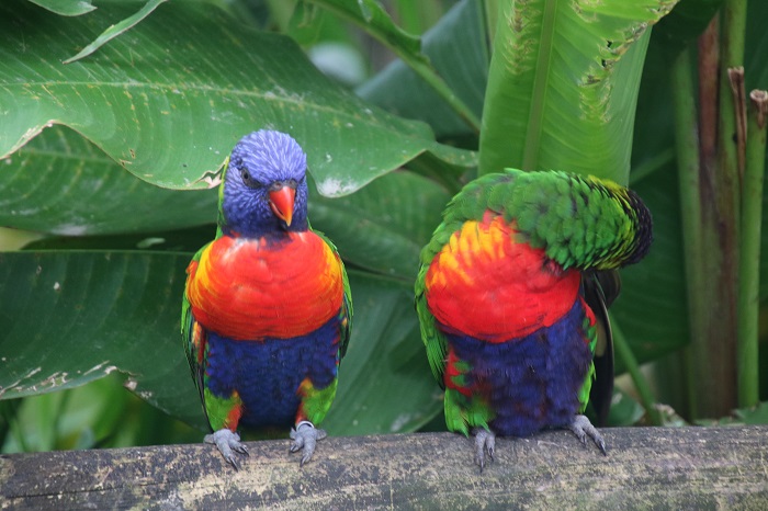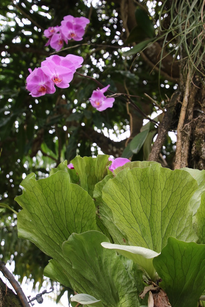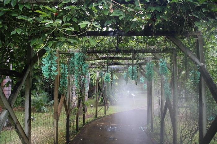 Brenda and I used to have a greenhouse and have a soft spot in our hearts for orchids, especially phalanopsis.  Stag horn ferns are also a favorite of ours. There was an aviary we could walk inside of.  Many parrots flying all around. This arbor, a sort of rainforest tunnel, sprayed a fine mist every few minutes.  It was covered by a tangle of vines.