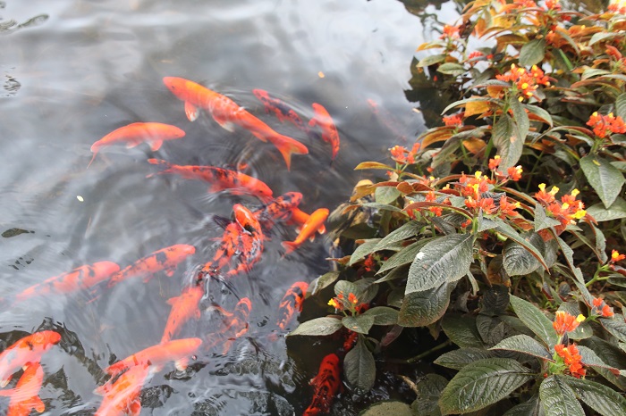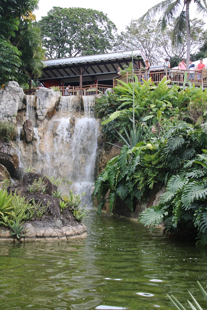 As you enter the gardens this is the view that greets you, a beautiful reflecting pool. The pond is teeming with koi, all looking for a hand out.   “Feed me, feed me”.They have a lovely cafe on top of a waterfall.   We had lunch there with another cruising couple, Dale and Cori of Hi Flite, who we met when Cori offered to take our photo. They have lived aboard for 14 years.  We enjoyed getting to know them a little bit.