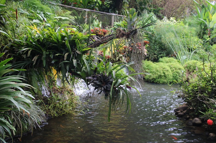 Everywhere you looked there was a riot of colors and textures.  Very well laid out to be viewed as grand spaces…As well as intimate corners.   A lovely “fallen” tree, repleat with bromiliads overhanging a pond. With all the lush vegitation, birds of all kinds.
