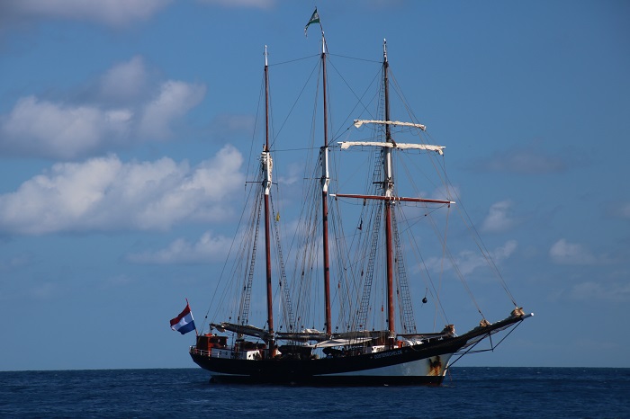 This ship, the Oosterschelde, now doesn’t that just roll off the tongue, is a three masted schooner training vessel from the Netherlands. She will celebrate her 100 anniversary next year and is still going strong. We have seen her in a number of harbors, most recently when she arrived in Antigua this morning. She’s a bit rough but has nice lines.
