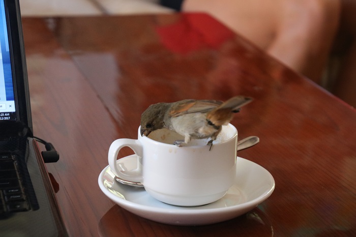 As I type away, I a feathered visitor seems completely unconcerned that my hands were typing away so close by.
