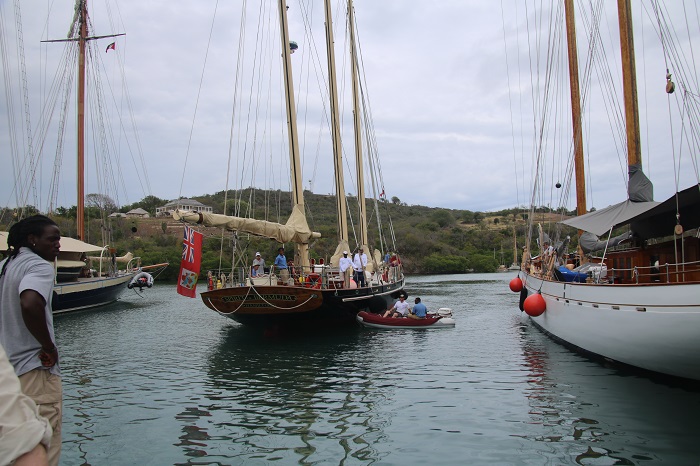 After finishing up the paperwork required to leave Antigua, Craig and I walked out to the lookout at the head of English Harbor, to the spot where British troops were once stationed to watch out for enemy ships.    Along the way was a beautiful flowering tree with perhaps a dozen hummingbirds vying for the most choice flowers.  Now, we are working to get a glimpse of the beautiful classics.  Turn around, face the harbor and there is plenty to look at.  A few days ago these docks were nearly vacant.  Now, more yachts arrive every day.  In a week’s time the place will be wall to wall classics.  As we watched, the three masted schooner Spirit of Bermuda rounded the point and prepared to enter the harbor.   She was built in Rockport maine and launched in 2006 and serves as an educational vessel and ambassador for Bermuda.  I have seen her in Maine and now here.  She’s a sight to behold with her impossibly tall masts.    You can crew on her if you’d like to spend time aboard.  Check out their site. The deployed their dink to help maneuver into position to med-moor against the bulkhead at the dockyard.They dropped their two bow anchors and backed toward the dock yard wall. The line handler caught the lines tossed to him by crew.  Neat, what you can do with action shooting at 4 frames per second.  Action shot, anyone?Even though they had a large crew on board, a tender pushing the stern as needed and line handlers on shore, it still takes brute strength to bring everything together.