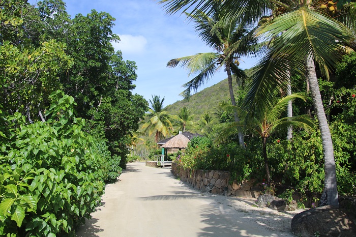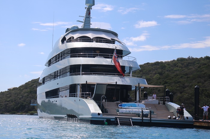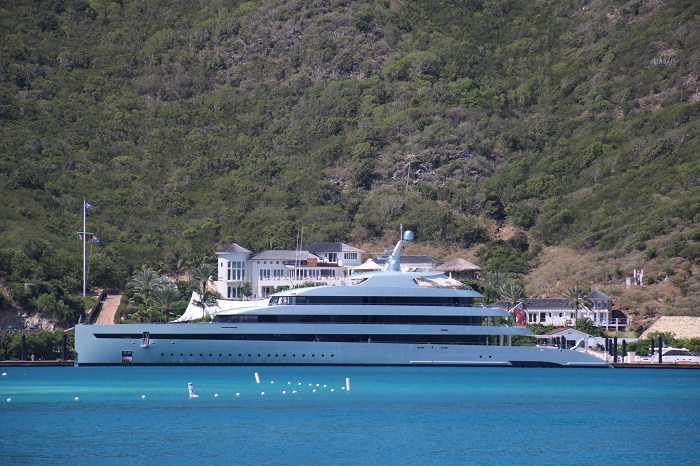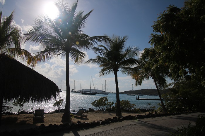 We arrive in North Sound BVIs at 04:00 and picked our way into the anchorage.   After a few hours of sleep we cleared in and took a mooring at the Bitter End Yacht Club, a very nice resort.   It’s very well manicured with paths along the water.  There are also plenty of “villas” up on the hill and plenty of spots to sit and relax. Perched on the hill, some of the villas look more like tree houses. Here’s Pandora on her mooring off of the beach.  We chose mooring “0” as it was the closest to the dock.As the sun set Pandora looked lovely framed by the palm trees. That evening a yacht, more like a ship, pulled up nearby. It was nearly 300’ long.