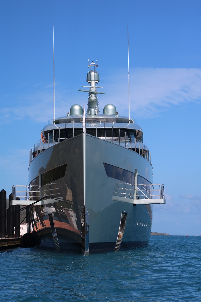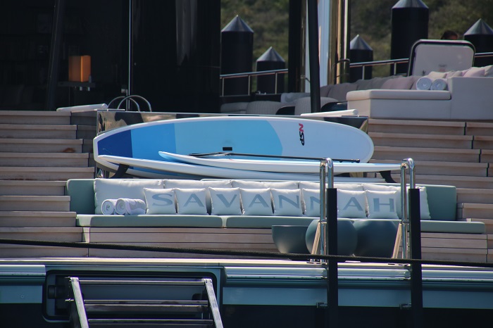 Savanna, doesn’t have a traditional transom. Actually, nothing about this yacht is traditional and her name is spelled out in cushions on the aft deck.  How trendy.  She sports a plumb bow and looks like she means business.Savanna sports a crew of 20.   A few of them on the dock give a feel for the scale of this boat. So what does it take to be able to afford such a yacht?   The answer is a net worth of $1,000,000,000.  Did I get the number of “0s”right?  That’s a billion.  And they say that when considering how much to spend on your yacht assume that you should not spend more than 10% of your worth on such an endeavor.   It seems that’s exactly what Lukas Lundin did when he had her built as it’s estimated that it cost him $100m by the time Savanna was launched in 2015.