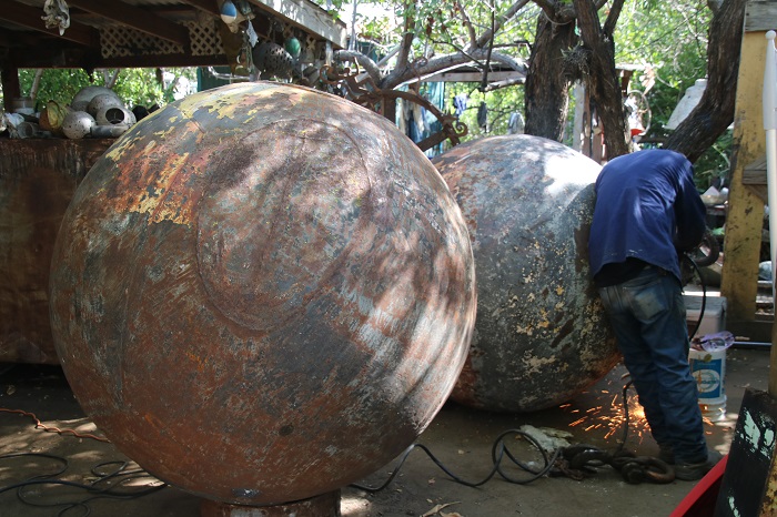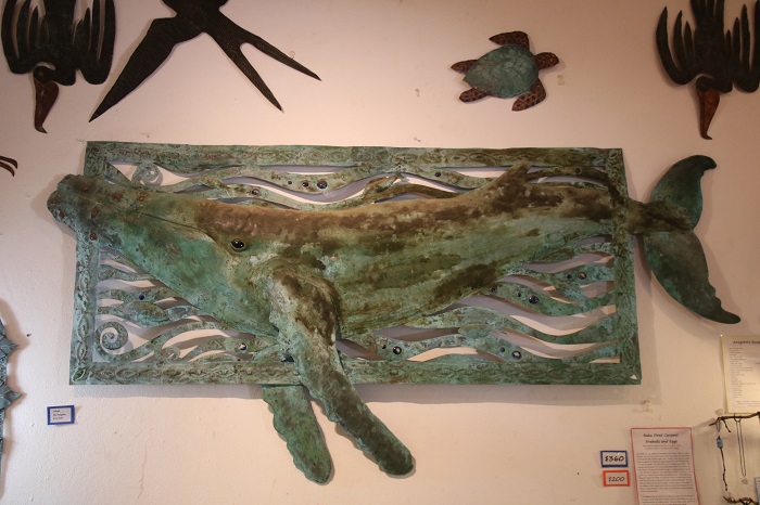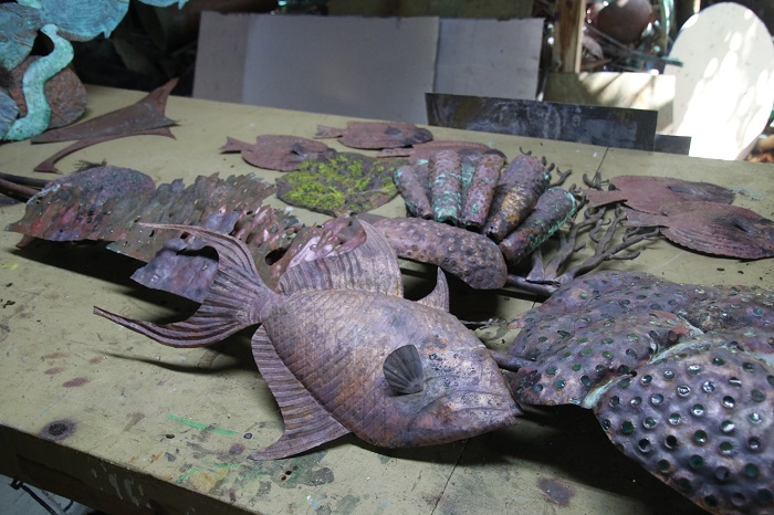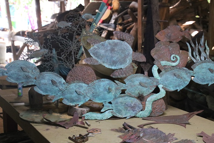 His studio is out back and is a jumble of materials and partially finished pieces. Clearly, he draws inspiration from nature in the Caribbean. With a marine theme throughout. This piece is about 8′ wide.  While there’s plenty for sale in his shop, the grounds are littered with much of his work as well as that of other artists that share his space. A lot of his work is fabricated from “found” items.  Once a cargo net?  Now, who knows but it is very purple.