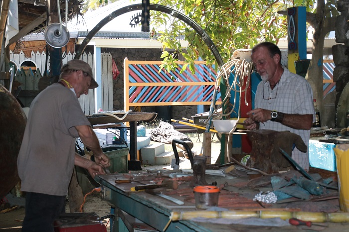 Here he is working in his studio.  He’s the guy on the left.  He invited me into his studio, sand floor and all.    So much for OSHA safety regulations.  “Don’t worry, you’re in the islands mon.”  This link will tell you a bit about his background.