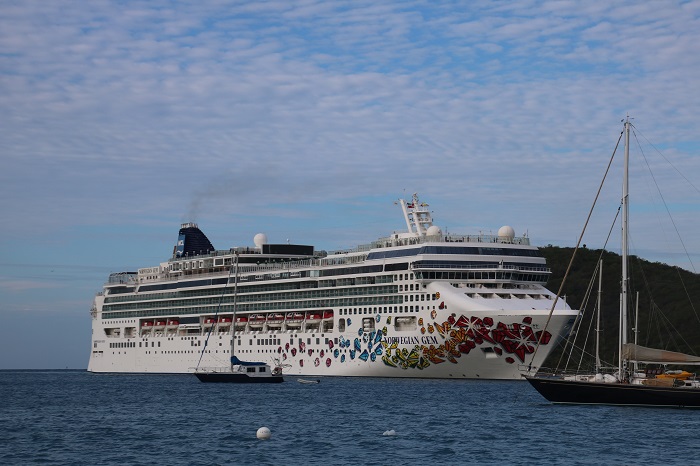 The harbor here in St Thomas is quite large, with room for many boats as well as huge cruise ships.    This one came in this morning and maneuvered itself up to the dock. As it turned to back into it’s berth it looked like it was going to sweep a few boats away in it’s wake.  It looked precariously close to this powerboat but probably wasn’t.I am told that sometimes there are four of these monsters in residence with one having to anchor out and use it’s stern thrusters to keep from swinging into the anchored boats.